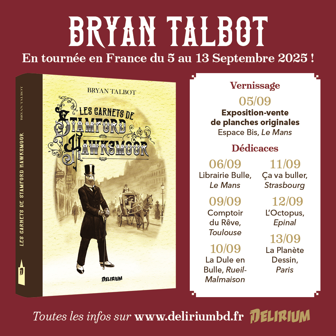C'est parti ! Rendez-vous ce soir à l'espace Bis de la librairie Bulle au Mans pour le vernissage de la magnifique exposition de planches originales de Bryan Talbot, en sa présence, à l'occasion la sortie de sa toute dernière création, Les Carnets de Stamford Hawksmoor ! Et ensuite, grande tournée de dédicaces à travers la France, pendant une semaine ! https://www.deliriumbd.fr/exposition-de-planches.../ Et pour retrouver tout le programme de la tournée de dédicaces : https://www.deliriumbd.fr/tournee-bryan-talbot-sept2025/ (également en pièce jointe)