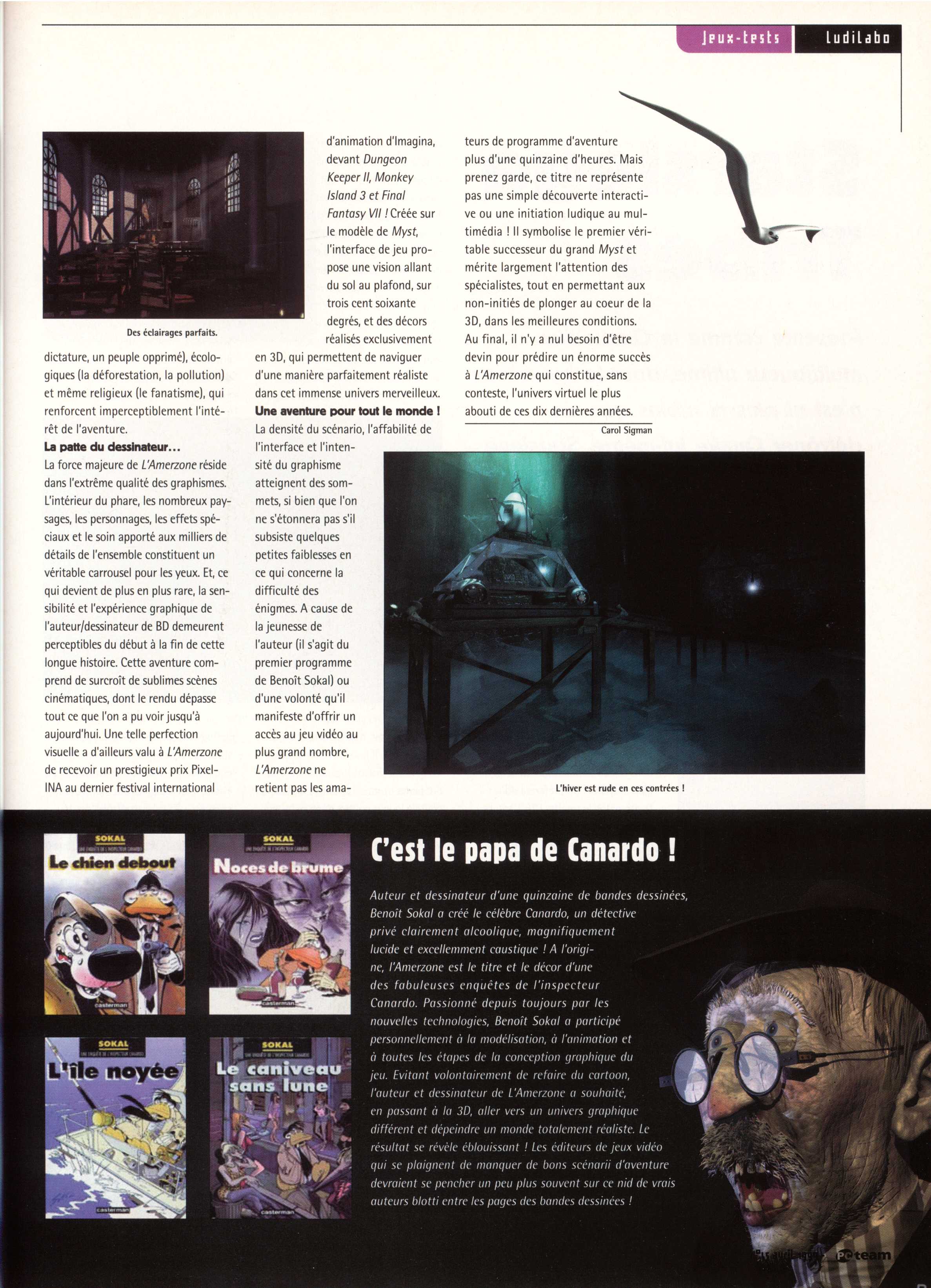 L’histoire s’inspire effectivement de Canardo, mais prend quelques libertés : « Le joueur incarne ici un journaliste à l'identité inconnue. Voulant réaliser l'interview d'un vieil explorateur du nom d'Alexandre Valembois, le journaliste se rend dans un phare où habite le vieil homme. Celui-ci, mourant après un long monologue destiné au jeune reporter, lui livre une tâche qui ne va pas sans sa part de mystère : aller en Amerzone pour y ramener l'œuf des Oiseaux Blancs ». (Source : Wikipédia) Le résultat est un jeu « à la Myst / Riven », deux grosses influences assez visibles, notamment dans les environnements visités. Nous avons donc affaire à un « point and click » traditionnel : le joueur avance, observe ses alentours, ramasse des objets pour ensuite les utiliser au bon endroit. Le carnet de voyage d'Alexandre Valembois, découvert en début d’aventure, développe un peu l’histoire et nous permet de marcher sur les pas de l’expédition de 1932. Il contient également des indices importants pour la progression (quel est donc le mot de passe du terminal dans le phare ?) ainsi que des beaux crayonnés et aquarelles de Benoît Sokal - un délice pour les yeux.Mon avis