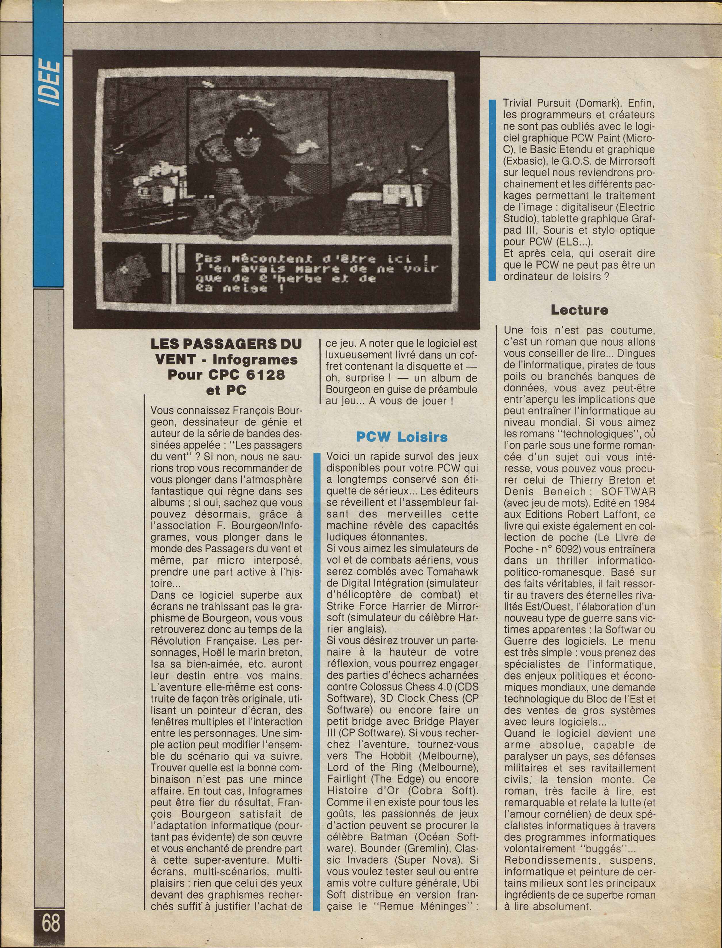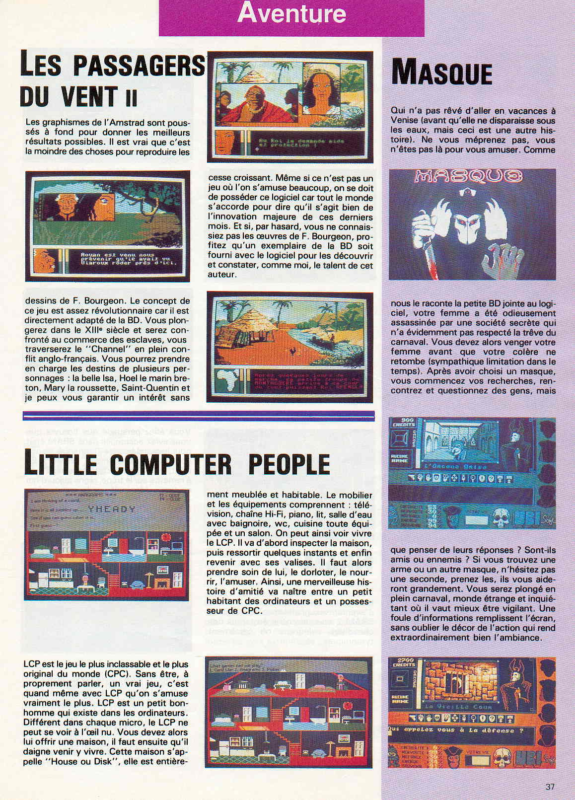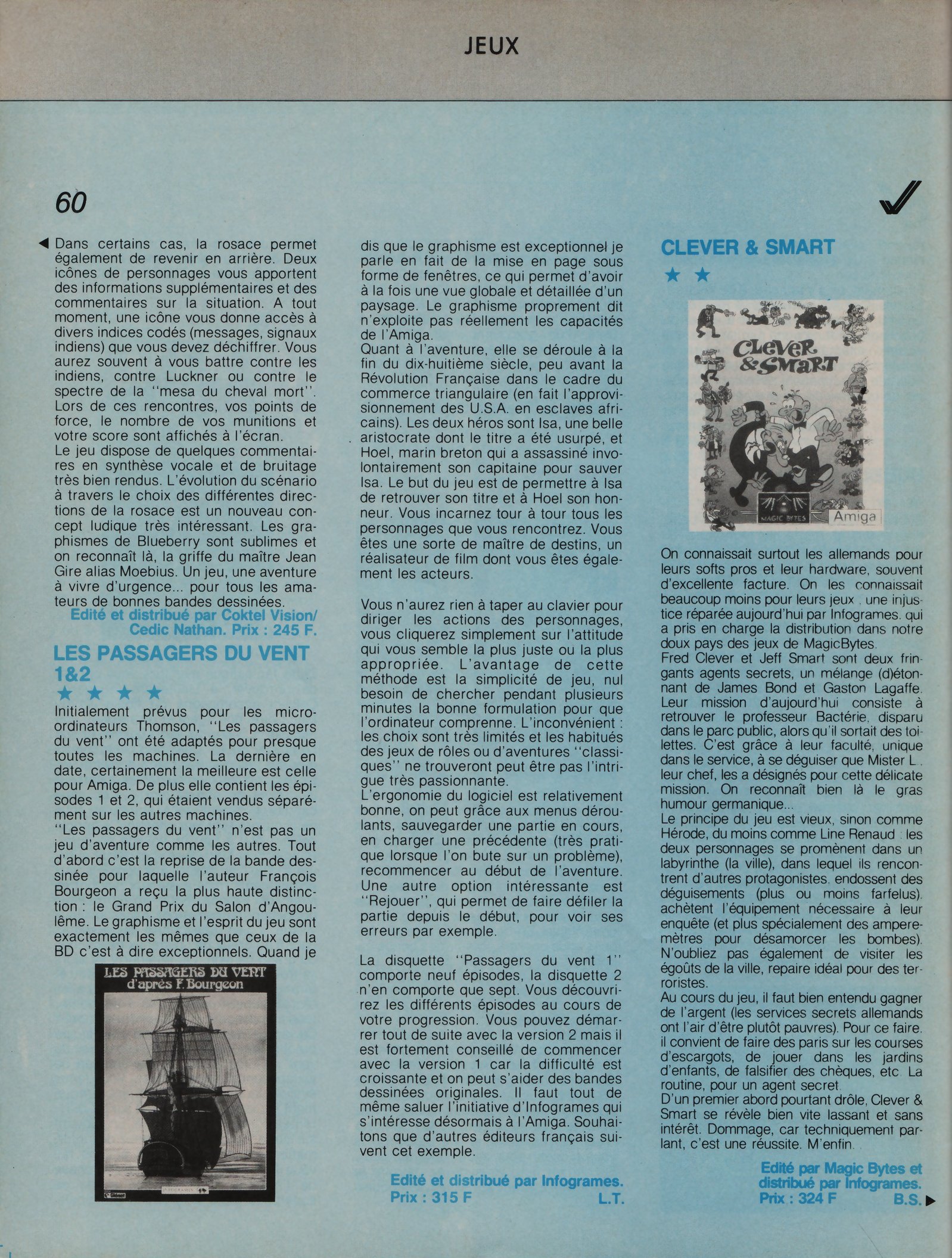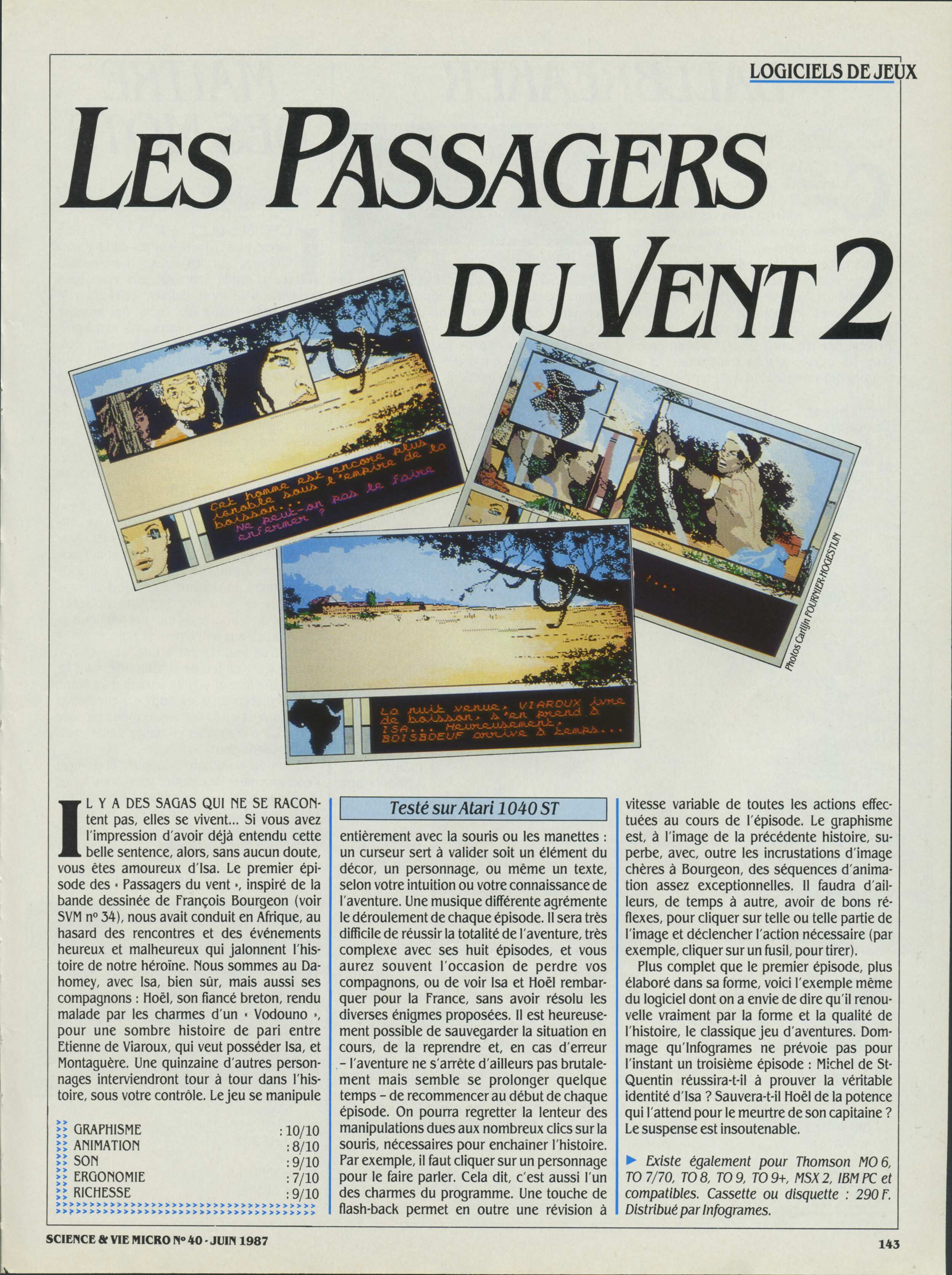 Tout ceci est alléchant, les tests des magazines de l’époque (voir ci-dessous) étaient vraiment dithyrambiques… mais on retrouve malheureusement les frustrations souvent associées aux jeux d’aventure des années 80. L’interface, moderne en 1987, est difficile à appréhender de nos jours, et j’ai dû lire la notice pour en comprendre le fonctionnement. Le concept même du jeu est rigolo au début, mais montre rapidement ses limites : on clique aléatoirement sur l’image du haut pour trouver les personnages (de moins en moins visibles au fil des chapitres, jusqu’à devenir un pixel difficile à débusquer), puis on choisit les dialogues qui semblent le mieux coller à l’histoire, de façon souvent arbitraire. Si le premier épisode est plaisant et assez facile, le deuxième se corse nettement : on se retrouve souvent dans une impasse à cause d’un mauvais choix effectué plusieurs écrans plus tôt. Il faut alors recharger une ancienne sauvegarde, et essayer de deviner ce qu’on a oublié, ce qui n’est pas toujours aisé. Lire la BD m’a parfois aidé à identifier mes erreurs, mais on navigue souvent dans le brouillard, et j’ai dû à plusieurs reprises me servir de vidéos YouTube (voir ci-contre) pour me débloquer. J’ai jeté l’éponge dans le tout dernier chapitre, que je n’ai jamais réussi à terminer. Les graphismes étaient peut-être de qualité à l’époque (surtout sur Amiga), mais impressionnent beaucoup moins aujourd’hui, même quand on les compare au « pixel art » des années 90. Un jeu au charme indéniable, qui a su retenir mon attention pendant quelques heures, mais que je recommande uniquement aux aficionados de jeux d’aventure vintage. Je mets quand même 3/5 parce que j’ai pris un certain plaisir à voyager en compagnie des personnages attachants de Bourgeon. Verdict :Comment y jouer aujourd'hui ?