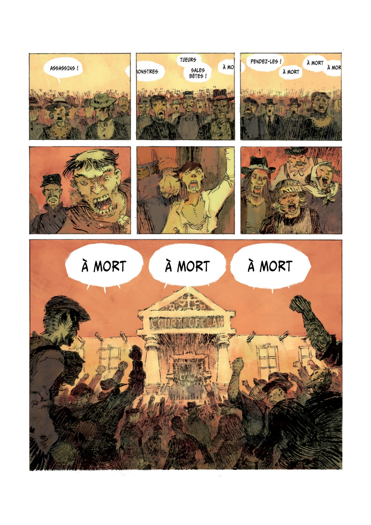 L’album commence par une scène qui se situe vers la fin de l’histoire, celle du procès de ces fameux « Affamés ». Ce qui m’a frappé c’est la façon dont le juge s’exprime : non par des bulles, mais par des tableaux avec ses paroles, comme des films muets de la première époque.