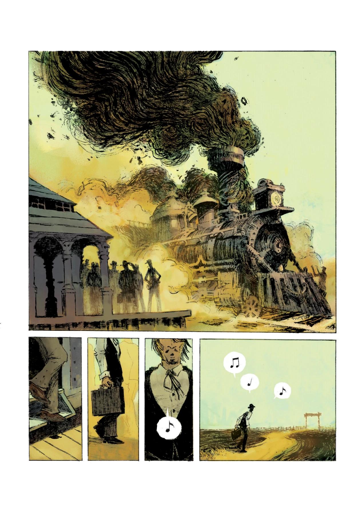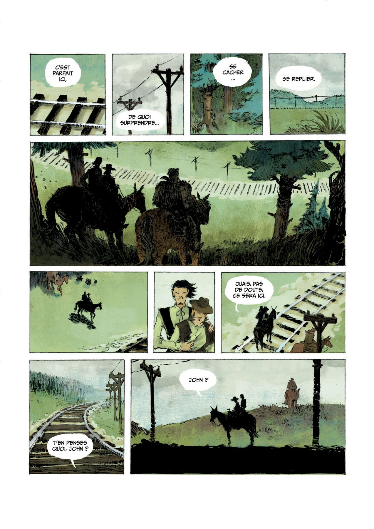 LM : De par mon parcours de galeriste, il est évident que j’ai choisi Jolan pour son dessin. En quinze ans d’expérience, des auteurs de moins de trente ans capables de faire des planches d’une telle puissance, je n’en ai pas vu beaucoup. J’étais fasciné par son dessin, il y a quelque chose d’atypique et de mature. Si on gratte un peu, on trouvera des défauts bien sûr. Si je suis plus attiré par le côté graphique, au niveau de l’intrigue c’est plutôt Jeff (Legrand) qui a aidé Jolan. La plus grosse séquence de travail collectif a été la mise en place du storyboard de l’album. L’histoire aurait peut-être pu être plus dense, mais avec le recul, on a réussi à y mettre l’essentiel de l’histoire des trois protagonistes, les évènements, les sentiments. Il n’y a pas de longueurs, on va à l’essentiel, dès le début du récit le ton est donné. Le seul moment de respiration c’est ce passage où les deux cousins sont sous un soleil caniculaire, à juste observer. Tout est toujours plus lent sous la canicule. Lorsque le train arrive, le récit repart sur un rythme plus soutenu.