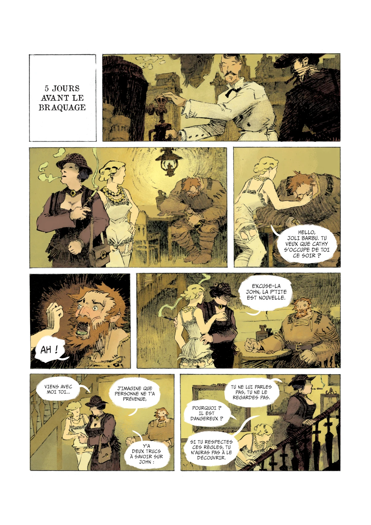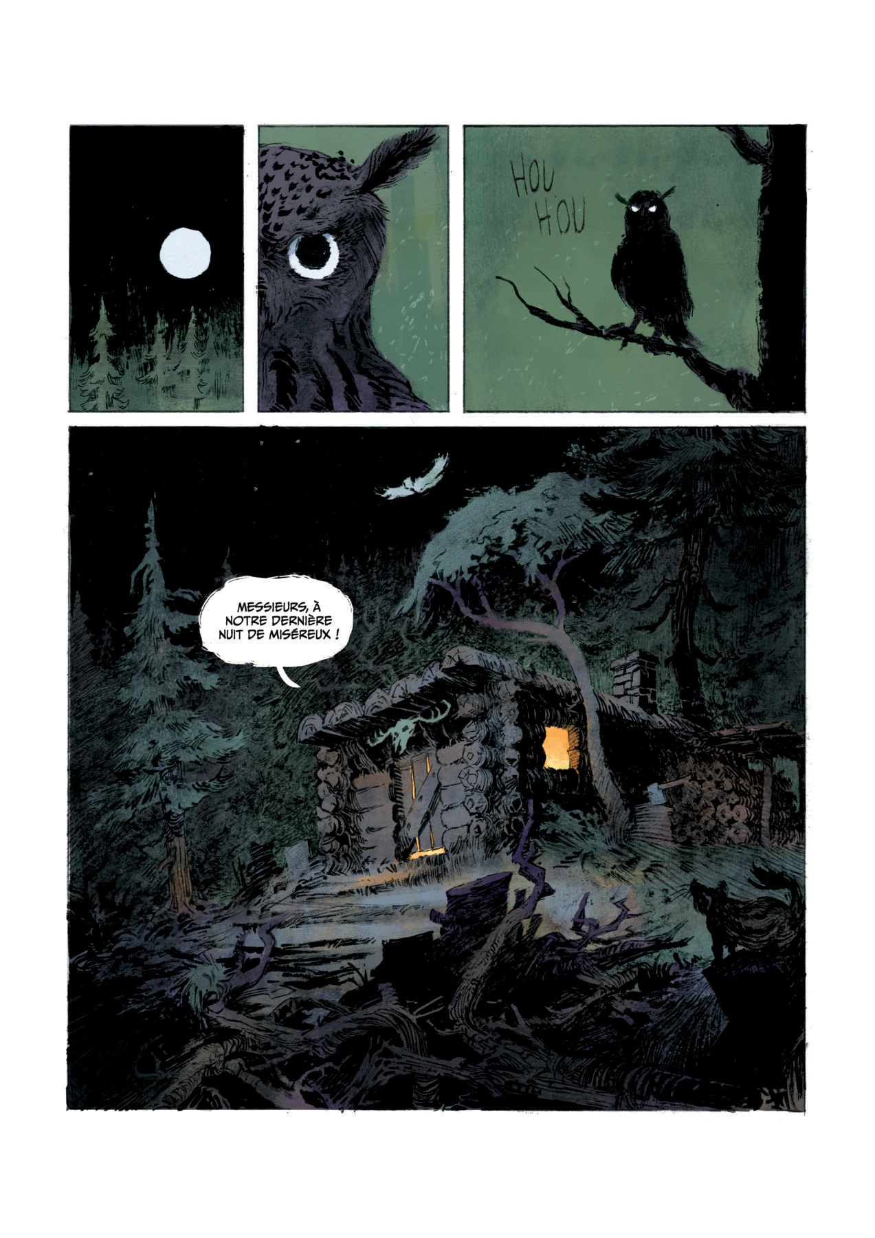 LM : Moi c’est ma planche préférée. Pas sûr que ce soit ça ta référence, mais ça m’a rappelé une scène de Dracula, quand Van Helsing, Jonathan Harker et leurs alliés sont présentés. C’est une scène où les personnages sont pris de terreur et de sidération face à l’horreur qui les attend.