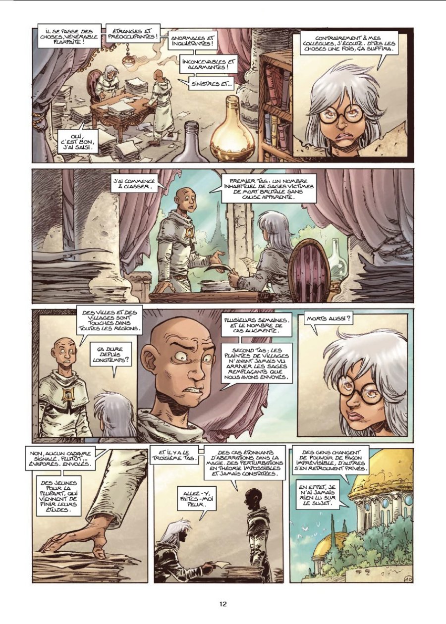 Un bonheur pour ado de fin de collège: un univers exotique, des bourrins sanguinaires, des seconds rôles comiques, des méchants vraiment méchants et des bombasses. Tout ce que le JDR proposait de mieux dans les années 90 est plaqué sur image. Le charadesign est sympa, les détails des vêtements, accessoires et bâtiments sont immersifs, rien à redire. Mais avec le temps, on voit de plus en plus le côté mysogine et graveleux et. Alors forcément ça relativise la note pour une BD qui se lit et relit sinon sans ennui. Edit: je viens de lire qu'il a remporté l'Alph-Art jeunesse des 9-12 ans. Franchement pour l'exemple et le côté gore de certains combats, je ne le conseillerai sûrement pas à un gamin ou une gamine de 9 ans. ------------------------------------- MàJ après relecture des 8 tomes: Je passe la note de 3 à 4 car l'alchimie entre les personnages est exemplaire, chacun est bien fouillé mais ne prend pas la couverture vers lui. De temps à temps à autres, la scène sera dédiée à Hébus et ses mouches, à Cian et son plan mariage, à Nicolède gérant ce qu'il peut encore gérer, à Cixi et son tempérament qui ne demande qu'à s'enflammer et exploser, à Lanfeust tantôt valeureux tantôt neuneu. Les contrées sont des clichés du jeu de rôle mais il fait bon s'y promener. Et il y a tous ces jeux de mots glissés par-ci par-là qui ne demandent qu'à être découverts. Contrairement aux Chroniques de la lune noire, l'auteur évite la surenchère d'action (si l'on met de côté le tome final) et exploite bien chaque pouvoir ou capacité. Malheureusement, les 2 derniers tomes tirent en longueur avec de très sérieuses affaires de cœur qui dénote avec le ton badin 2 pages avant et 2 pages plus tard et beaucoup trop de clins d'oeil bien appuyés (Astérix, Arzach, Zorro...) qui font rire puis soupirer. Lanfeust bâtissait sa propre légende, dommage qu'elle pencha vers le fan service, Gottferdom ! La fin expédiée laisse sur sa faim mais cette série nous aura tellement fait voyager qu'on passe l'éponge.