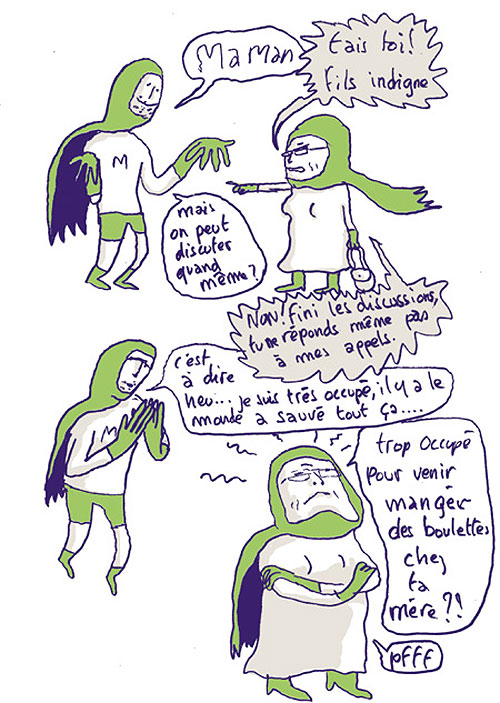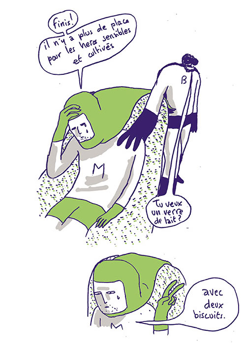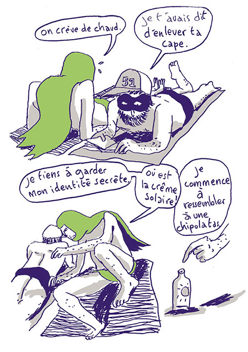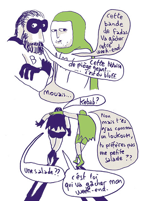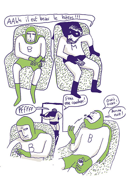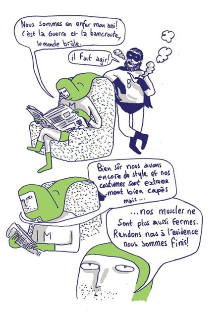 Les choses sont claires dès le début : on est dans le foutraque, l’absurde, le débile. Nous montrer des gars qui portent des slips par-dessus leurs pantalons en lycra, les Américains le font depuis 50 ans et plus. Les français les tournent en dérision depuis presque aussi longtemps. Bessam et Mucho font partie de ces super-zéros, ces glands qui préfèrent aller passer un week-end à la plage plutôt que de sauver le monde… Pour le coup c’est vraiment du n’importe quoi ; on a un peu l’impression qu’il n’y a pas de scénario, que l’auteur l’écrit au fur et à mesure du récit, et du coup ça ne ressemble plus à grand-chose… Le style graphique de Ludvick Hernandez est très naïf, mais cela n’est pas gênant dans un récit de ce type… Malgré son côté foutraque assumé, je ne suis pas rentré dans l’esprit de cette suite d’histoires courtes sans saveur.