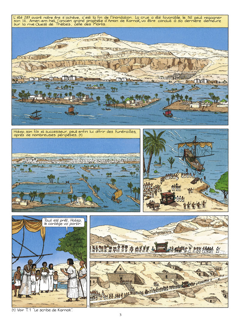 Après avoir été l'assistant de Jacques Martin, dessiné 5 épisodes d' Alix et participé à la série éducative "les Voyages d'Alix", Rafael Morales se lance dans sa propre série avec cette saga historique sur l'Egypte antique. Mais la période décrite ici n'est plus celle de la glorieuse Egypte pharaonique; l'action se situe en 287 avant J.C., alors que le pays est sous domination grecque. Le roi Ptolémée Ier règne à Alexandrie, capitale fondée par Alexandre le Grand 45 ans auparavant, au détriment de Thèbes, où est cependant respecté le culte d'Amon au temple de Karnak. En souverain avisé, Ptolémée aime l'Orient comme l'aimait Alexandre, et a su préserver les traditions millénaires. Mais un nouvel épistatès (représentant du roi grec auprès du clergé égyptien) est nommé à Thèbes, Déméas, qui d'emblée se montre hostile et s'impose en conquérant arrogant, désireux de prélever de nouvelles taxes afin d'accabler le peuple et affaiblir les prêtres. Avec l'aide du fourbe Péritas, nouveau stratège de la Thébaïde, il s'oppose à Hotep, premier scribe du temple de Karnak et grand prophète d'Amon. Les scénarios bien documentés servent un peu d'alibis à Morales pour décrire une Egypte renaissante sous le pouvoir grec, tout en conservant ses traditions, et surtout pour représenter de somptueux monuments, dessinés avec une minutie héritée de J. Martin, tels les temples de Louxor et Karnak, ou le fabuleux phare d'Alexandrie, qui constituent une collection de très belles images agréables à regarder et dotées de couleurs chatoyantes. D'ailleurs, le trait académique des décors tranche nettement avec celui plus rond des personnages. Enfin, ne jetons pas la pierre à Morales, il lui faudra un peu de temps pour se débarrasser de l'emprise graphique martinienne, avant de trouver son style; Chaillet l'a fait avec La Dernière Prophétie. C'est quand même une jolie série qui s'ajoute à celles utilisant l'Egypte pour décor. Je l'avais découverte en 2011 lors d'un passage parisien à la boutique Dream's, et j'aimerais bien en connaître la suite. J'ai réussi à ce jour à trouver le tome 2, c'est un épisode qui fait allusion au précédent mais qui a son autonomie ; je n'ai pas retrouvé les mêmes qualités qui m'avaient enthousiasmé dans le premier, c'est un peu moins passionnant, peut-être trop compliqué, c'est encore une histoire de complot doublé d'un assassinat qui entraînent des péripéties, bref il se passe trop de choses, et j'ai dû le lire 2 fois. Sinon, j'ai relevé une bonne restitution des rites funéraires égyptiens, et Morales est toujours aussi doué pour dessiner des décors fabuleux, tel le temple de Karnak qu'il se plait à montrer sous tous les angles ; il y a aussi toujours cette impression des personnages ronds au trait plus épais comme posés sur ces décors au trait fin, mais ce n'est pas gênant à la lecture. Ma note reste donc inchangée.
