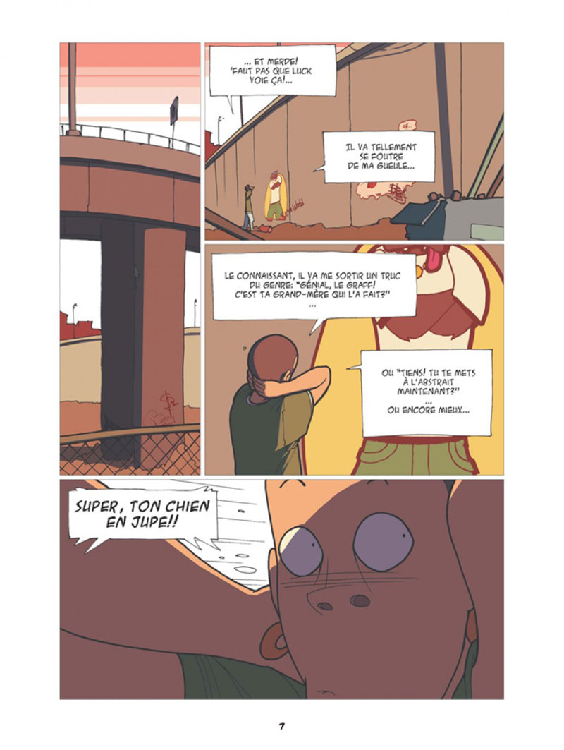 Note : 2.5/5 J'ai été agacé durant une grosse moitié de cet album par cette mise en scène d'un ado rebelle, artiste urbain vivant aux crochets de ses parents et qui se vante de narguer la police. J'ai craint de lire le récit d'un grand adolescent fan de graffiti qui met cet art en avant comme étant trop cool et tant pis pour le reste de la société. Cette impression n'était pas arrangée par un décor artificiel très américain (quoique le mur favori des héros ressemble un peu au mur de séparation israélo-palestinien), un graphisme "moderne" et épuré vraiment pas à mon goût, notamment au niveau des visages des filles qui se ressemblent toutes, et par une narration au rythme très hachée. On se perd en effet trop souvent dans les pensées et l'imaginaire du héros, comme autant de digressions souvent inutiles qui plombent le récit ou qui viennent le rendre saccadé. Heureusement, le ton gagne un peu en maturité au fil des pages. La perspective du jeune ado est un peu élargie, il fait preuve d'un peu moins d'égocentrisme. Et la fin se révèle relativement bonne, même si elle se fait un peu en queue de poisson en laissant en plan beaucoup de sujets ouverts. Bref, je n'ai pas vraiment aimé, mais ce n'est finalement pas une lecture si mal que ça.