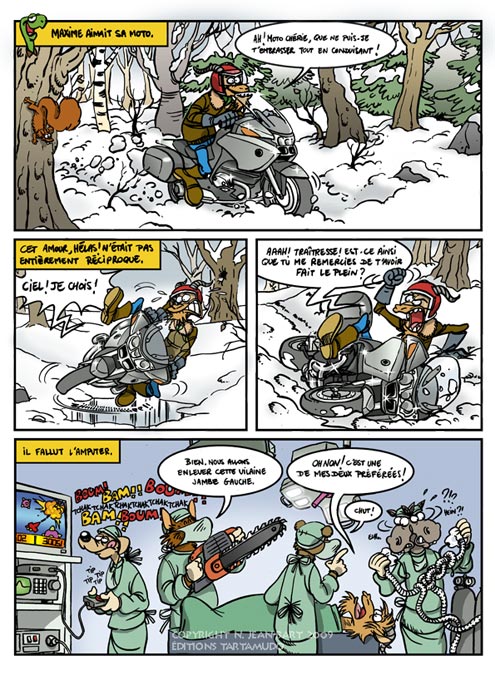 Je ne suis pas un grand amateur de l'humour de motards, peut-être parce que je ne fais pas partie de cet univers. Mais par curiosité j'ai bien voulu lire cette série de gags les mettant en scène, sous des traits animaliers. celle-ci se démarque par un humour difficile à définir, tant il navigue de l'absurde au purement caca-pipi en passant par de la philosophie de comptoir. Tout cela est forcément assumé, mais parfois un peu étrange, comme si la mécanique du gag n'était pas toujours bien assimilée par le scénariste. En effet il y a deux ou trois gags que je n'ai tout simplement pas compris... Les deux albums sont dessinés par deux auteurs différents, aux styles proches cependant, avec comme constante des gros cubes toujours très réalistes, malgré un encrage très gros nez par moments. Ce n'est pas désagréable, c'est assez efficace. Cependant ce n'est pas vraiment mon truc. je recommande toutefois aux bikers d'y jeter un coup d'oeil pour une meilleure appréciation.
