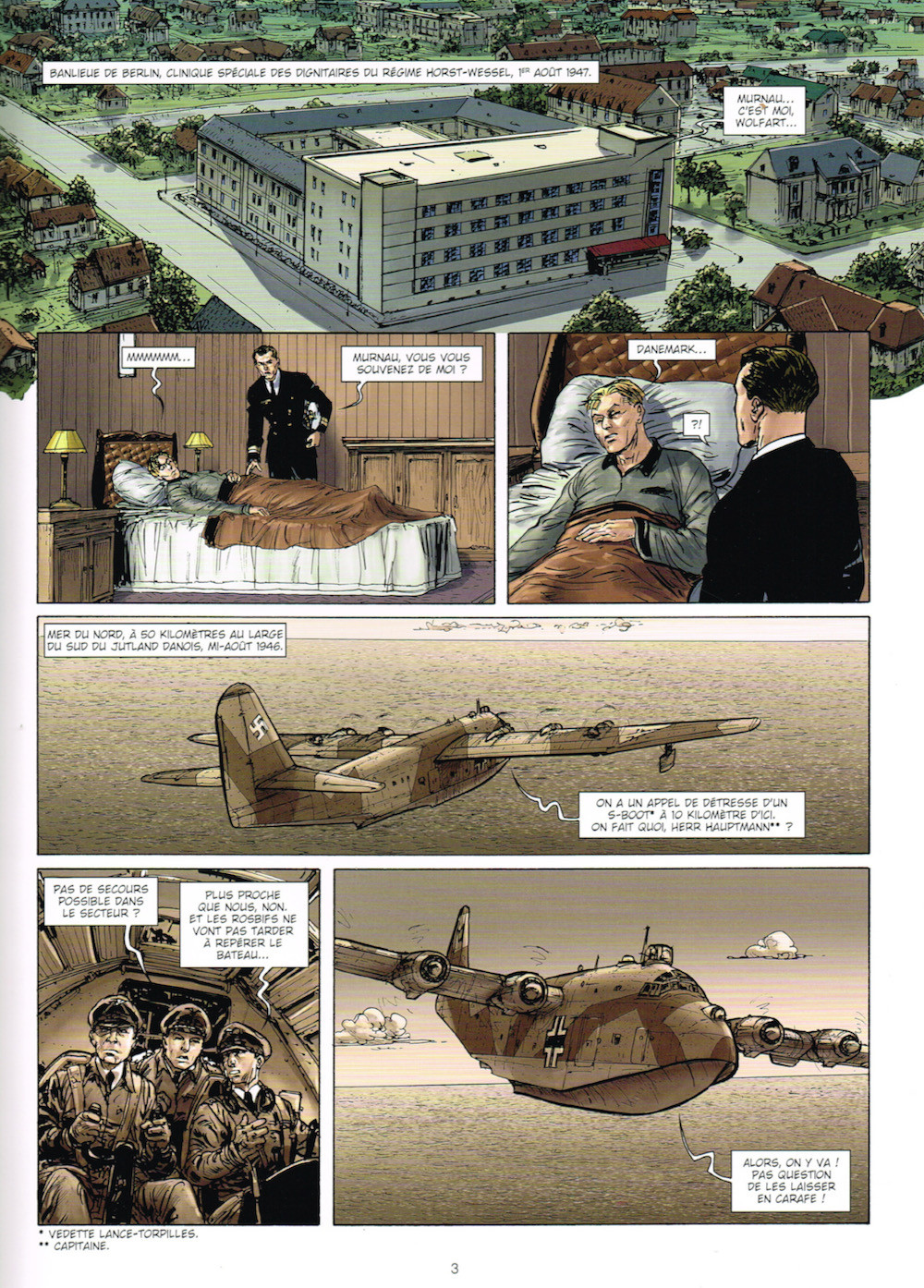 Je viens de lire les quatre premiers tomes, sans déplaisir, mais sans être emballé non plus. Le dessinateur maîtrise bien les avions bizarres des nazis et les combats aériens son assez convainquant, heureusement d’ailleurs, car ils occupent une très large partie de chacun des albums Pour les personnages, qui ont un peu tous la même tête, et les décors, souvent sommaires, son travail est moins convaincant. Quant à la mise en couleur, elle est un peu terne dès que l’on est au sol. Un dessin correct, donc, mais inégal selon les séquences narratives. Et justement, c’est par le scénario que pèche cette série. D’abord, il est nécessaire d’être un minimum plausible lorsque l’on bâti une uchronie. Si l’on n’est pas capable d’expliquer quels événements ont provoqué la bifurcation de l’histoire que nous connaissons, l’exercice devient vite périlleux. Or, on ne comprend pas, par exemple, comment un Reich à bout de souffle a pu tout à la fois arrêter l’offensive soviétique à l’Est, repousser les Anglo-américains à la mer en Normandie et développer des avions miracles avec son industrie en miettes. Les auteurs restent d’ailleurs très vagues. J’évoquais aussi les combats aériens qui trainent en longueur… Au début, c’est agréable, mais on se rend vite compte que si les personnages enchaînent loopings et mitraillage de l’ennemi, c’est souvent au détriment de l’histoire principale qui n’avance pas ! Les auteurs ont visiblement envie de confier à leur héros le manche de tous les aéroplanes étranges qu’ils imaginent, mais à la fin, tout ça fait un peu catalogue. Quant aux suspenses qu’ils tentent de distiller pour porter leur histoire ils sont assez niais. On devine très vite où ils veulent en venir avec Auschwitz-Birkenau, de même que la nature de leur découverte en antarctique est évidente… Il y a aussi le personnage principal, pilote émérite, trompe-la-mort, mais sans charisme ni personnalité. Le gaillard, antinazi convaincu, trouve moyen d’intégrer la SS. Bien que fâché avec l’autorité, il ne cesse de monter en grade. Et même écœuré par les exactions des nazis, il ne pense même pas à déserter. En plus, il n’arrête pas de coir la tête d’Hitler en rêve ! Autant dire qu’il n’est pas très attachant ; et c’est une litote. Bref, une histoire qui piétine, un héros que l’on pourrait haïr, mais qui n’est que pâlichon… tout ne tient finalement que sur les combats aériens ! Peut-être que maintenant que nous avons testé tous les Wunderwaffen du Reich et qu’on est enfin en route vers le pôle sud, les auteurs vont enfin montrer où veulent en venir ? Ce serait bien qu’ils pensent à conclure la série avant d’avoir lassé leurs lecteurs !