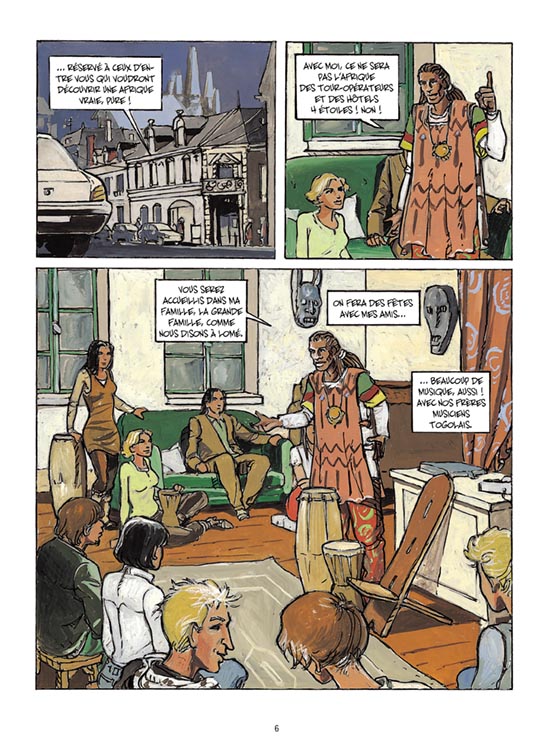 Les sectes sont un fléau, et il est vrai que cette histoire, inspirée de faits réels, fait un peu froid dans le dos tant elle comporte des accents de vérité. Mais c'est aussi ce souci de d'authenticité qui plombe un peu le récit. C'est un peu mou, on a l'impression que la lente descente aux enfers manque de dynamisme, de liant. Tant pis pour le sensationnalisme. Ceci dit j'ai apprécié cette volonté de ne pas en rajouter. A côté de cette histoire un peu poussive, nous avons le dessin d'Arnaud Floc'h, "spécialiste" des ambiances africaines, qui s'en sort encore une fois très bien, sa palette de couleurs permet de s'immerger complètement dans l'histoire, même si une partie se déroule en France. A lire pour voir quels chemins sournois peuvent prendre les mouvements sectaires.