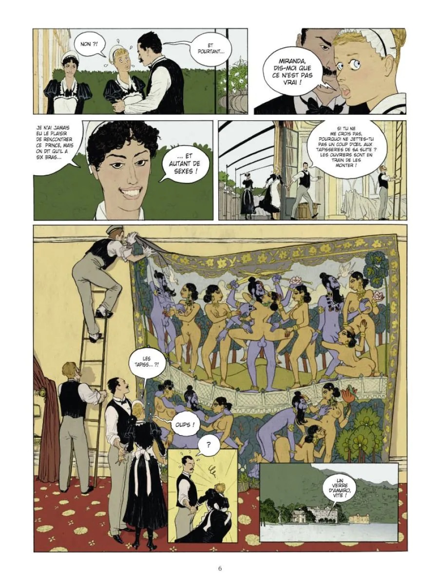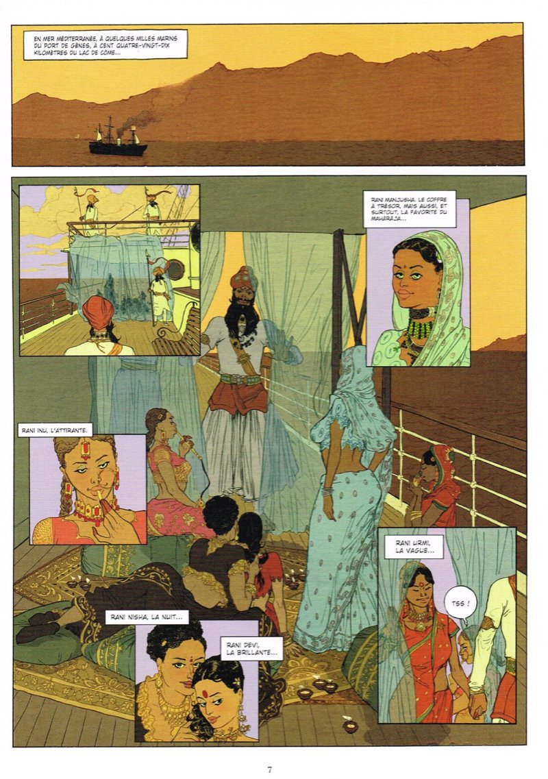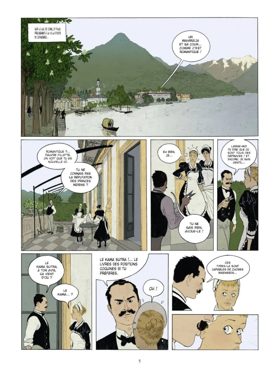 L’intrigue qui se passe en 1917 au bord du lac de Côme n’est pas tout à fait qu’un prétexte pour dessiner des scènes érotiques. Le Mahârâja Maharao Raja Raghubir Singh Bahadur qui vient d’arriver dans l’un des hôtels réputés qui bordent le lac va tenter de profiter de la situation instable provoquée par la Première Guerre mondiale pour rencontrer des représentants des forces de l’Axe et obtenir l’indépendance de son pays. Mais les Anglais qui ont eu vent de l’affaire ont envoyé sur place un espion du MI5, chargé de faire échouer les négociations et d’empêcher l’Inde de quitter l’Empire Britannique. Le scénario est bien écrit, et la combinaison espionnage et scènes érotiques plutôt réussie. Les personnages dignes d’une pièce de théâtre de boulevard (l’espion anglais qui passe du statut de tueur à gages à voyeur, le maitre d’hôtel plus que lourdingue, la femme de chambre pudique, la directrice qui s’accommode finalement facilement de son hôte soi-disant dépravé, le mystérieux Mahârâja qui ne dit pas un mot, mais a-t-il vraiment besoin de parler ?) Visuellement, c’est beau, élégant, les couleurs sont douces et sensuelles, et l’ensemble ne manque pas d’humour. Pour moi, le gros défaut de cet album c’est son rythme beaucoup trop rapide. J’aurais aimé que l’imbrication espionnage et scènes coquines ne s’enchaînent pas aussi rapidement. C’est très dommage.