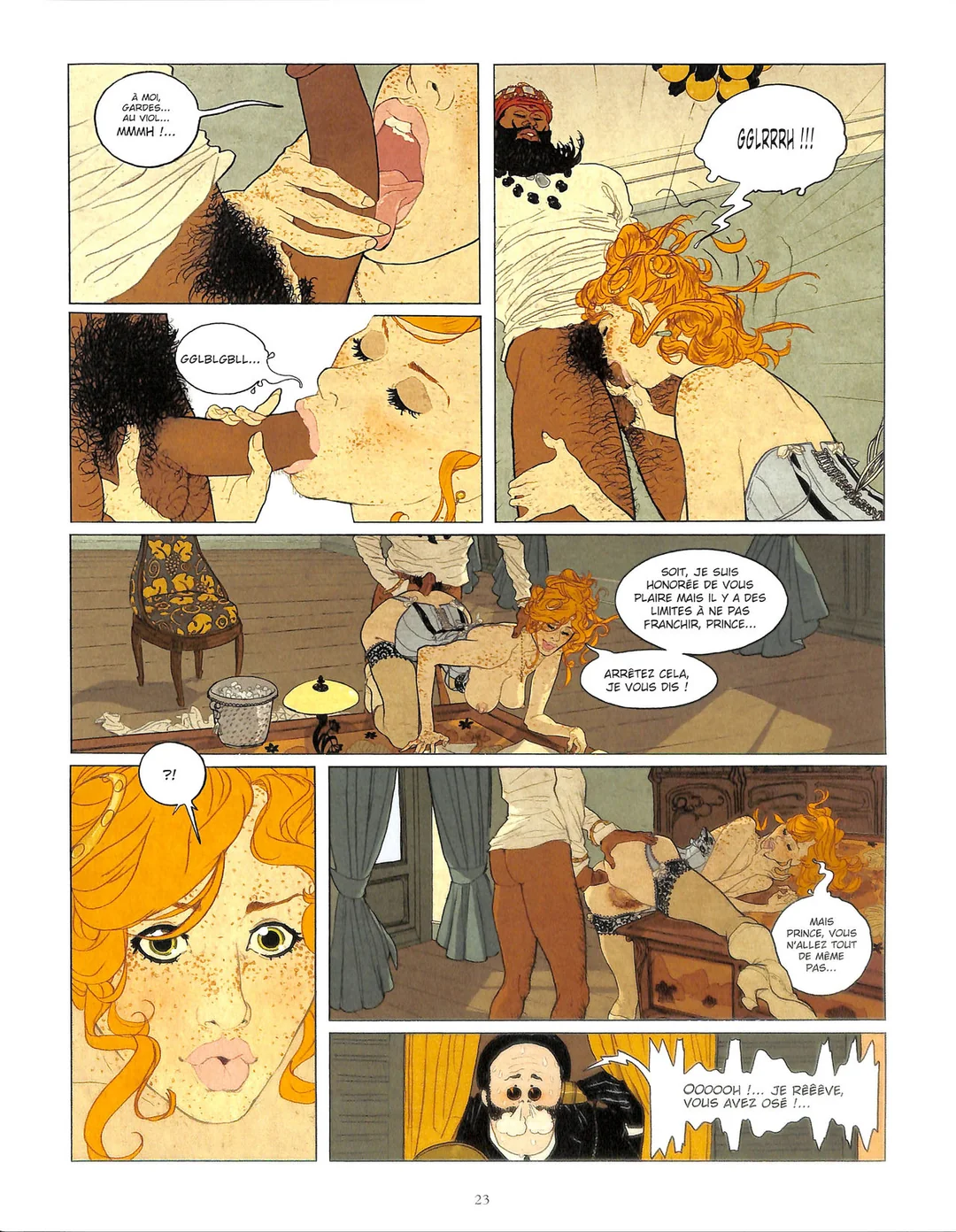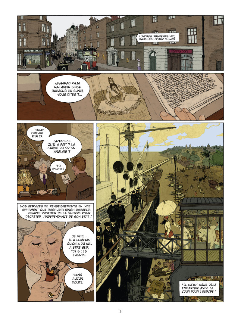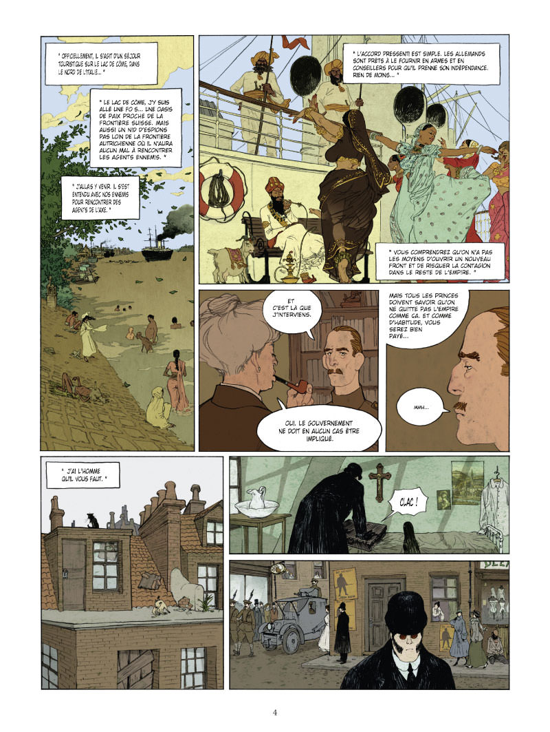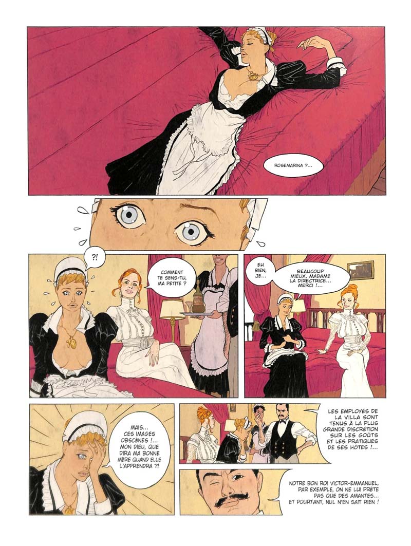 L’intrigue qui se passe en 1917 au bord du lac de Côme n’est pas tout à fait qu’un prétexte pour dessiner des scènes érotiques. Le Mahârâja Maharao Raja Raghubir Singh Bahadur qui vient d’arriver dans l’un des hôtels réputés qui bordent le lac va tenter de profiter de la situation instable provoquée par la Première Guerre mondiale pour rencontrer des représentants des forces de l’Axe et obtenir l’indépendance de son pays. Mais les Anglais qui ont eu vent de l’affaire ont envoyé sur place un espion du MI5, chargé de faire échouer les négociations et d’empêcher l’Inde de quitter l’Empire Britannique. Le scénario est bien écrit, et la combinaison espionnage et scènes érotiques plutôt réussie. Les personnages dignes d’une pièce de théâtre de boulevard (l’espion anglais qui passe du statut de tueur à gages à voyeur, le maitre d’hôtel plus que lourdingue, la femme de chambre pudique, la directrice qui s’accommode finalement facilement de son hôte soi-disant dépravé, le mystérieux Mahârâja qui ne dit pas un mot, mais a-t-il vraiment besoin de parler ?) Visuellement, c’est beau, élégant, les couleurs sont douces et sensuelles, et l’ensemble ne manque pas d’humour. Pour moi, le gros défaut de cet album c’est son rythme beaucoup trop rapide. J’aurais aimé que l’imbrication espionnage et scènes coquines ne s’enchaînent pas aussi rapidement. C’est très dommage.