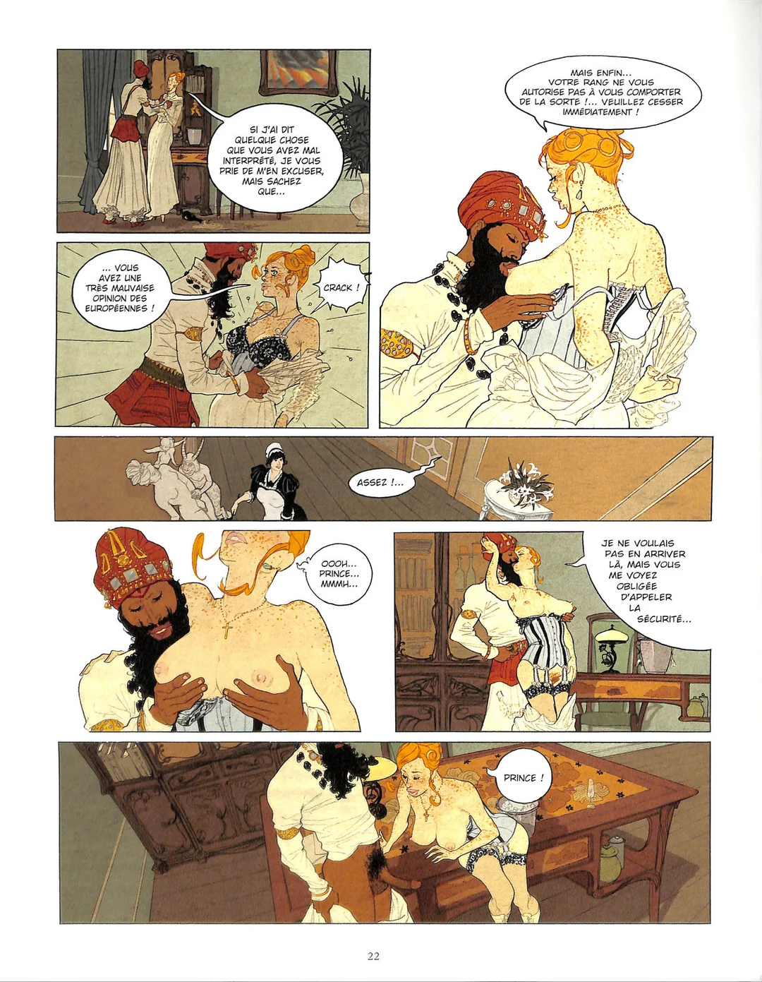 Le Maharaja en question n’est presque qu’un simple prétexte, un personnage certes au centre de l’intrigue, mais aussi finalement « accessoire » (dans tous les sens – y compris sexuels – du terme). Il ne prononce d’ailleurs pas un seul mot de tout l’album ! Nous sommes en 1917, année charnière de la première guerre mondiale, et ce Maharaja indien s’accorde une virée en Italie, au bord du lac de Côme. Il est suivi de très près par son imposant (et séduisant !) harem, et de presque aussi près par certains services secrets. En effet, il projette de déclarer l’indépendance de son royaume. Les services secrets allemands sont donc intéressés par cet affaiblissement potentiel de l’Empire britannique, et dépêchent du monde pour le protéger du MI5 anglais, qui, lui, envoie un tueur pour éliminer ce prince rebelle. Les déboires que va rencontrer ce tueur anglais dans l’accomplissement de sa tâche m’ont fait penser au personnage de Milan, incarné par Ventura dans le film « L’emmerdeur ». Et d’ailleurs, chaque apparition de ce personnage ajoute une bonne touche d’humour – et ce jusqu’à l’épilogue, en forme de grosse farce ironique et noire ! Vous l’avez remarqué, je n’ai pour le moment pas encore évoqué l’aspect proprement érotique de l’album. C’est dire qu’on a là – même si c’est parfois un peu rapide et succinct (j’ai en particulier trouvée un chouia bâclée la fin) – un vrai scénario, mêlant aventure, espionnage et humour. Mais on est bien là dans une œuvre érotique. En effet, les parties fines se multiplient, que ce soit parmi les différents groupes qui gravitent autour du Maharaja et de sa suite (Italiens, espions allemands, etc) – notre Anglais étant une notable et amusante exception, malgré les avances légèrement outrancières de sa gironde d’aubergiste ! Surtout, dans l’hôtel de luxe où séjourne notre Maharaja, tout est fait pour le satisfaire – et il a de sacrées envies ! C’est ainsi que la directrice de la résidence (une belle rousse que nous retrouverons, dans un autre contexte et dans un rôle plus central, dans l’album suivant du même duo, Nuits Indiennes) mettant son établissement, son personnel, et sa jolie personne au service de son riche et majestueux client. Que ce soit en petit comité ou en groupe plus imposant, toutes les positions y passent ! Pour finir, il faut parler du dessin d’Artoupan, qui est vraiment original et réussi. Il parvient à merveille à restituer décors et costumes de cette époque, avec un rendu parfois proche des tableaux de Klimt ou du style Art nouveau. Le trait est à la fois réaliste et faussement maladroit, avec des airs de vieilles revues de mode, tout en étant, malgré l’aspect un peu « statique » de certaines situations, assez dynamique pour ne pas être que de l’illustration. En tout cas, nous avons clairement là un album qui sort du lot dans le domaine de la BD érotique (voire plus), assez ambitieuse au niveau du scénario, et avec un côté graphique lui aussi « charmant ». C’est plutôt une réussite du genre. J’avais déjà aimé les Nuits Indiennes, lues auparavant, et remercie Jetjet de m’avoir fait découvrir ces deux auteurs.