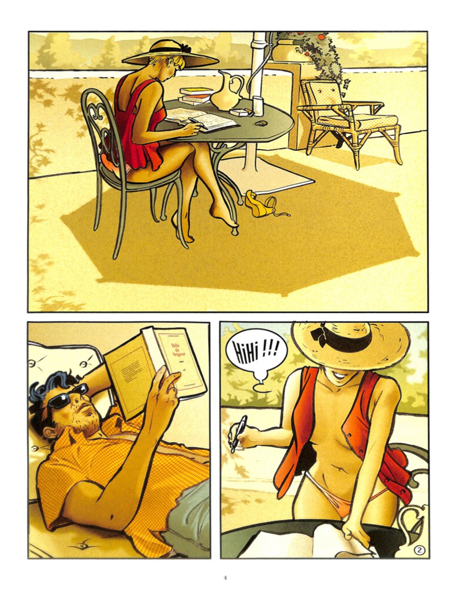 Une bande dessiné érotique ... Wait, whaaaat ?!? Et oui il y a plusieurs genres à la bd et il n'y a pas de raison de ne pas apprécier les genres différents. Alors ici on va essayer d'en parler, tout en restant calme et en gardant les mains sur le clavier ... et comme dirait Rocco : "Action !" Mélange de récit sentimental et d'érotisme, on nous raconte l'histoire de Lola d’Estressac. Belle aristocrate au bord de la piscine sous un soleil méditerranéen, elle va nous raconter ou plutôt confesser à travers son journal sa vie sentimentale où s'entremêleront le présent, le passé et le conditionnel sur son approche de l'amour où l'on se donne corps et âme. Petit à petit, chaque élément raconté sera en fait une conclusion dont le centre sera son homme, Régis, et un secret lourd de conséquences sentimentales et nostalgique comme une page d'un livre que l'on ferme non sans une pointe d'amertume. Ambiance et esthétisme des année 60, soleil, piscine, une belle fille en maillot qui s'effeuille petit à petit le long de l'histoire ... on se calme tout de suite, c'est pas du porno et cela reste très soft, donc ami pornographe et obsédé vous pouvez ranger votre matériel. Faut dire aussi que ça n'a rien à voir avec le titre de Richard Clayderman quoique ça peut mettre dans l'ambiance. Une BD donc, dessinée par Beja (le fils) et scénarisé par Nataël (Je suis ton père), tous deux Toulousains de leur espèce et connus notamment pour leur trilogie Les Griffes du Hasard que je n'ai pas lu mais on m'en a parlé beaucoup (j'en ai vu deux/trois planches et ça avait l'air d'être dans la lignée Jacobs/Ligne Claire). Que dire d'autre ? Pour moi un scénario plus que non-passionnant, une narration qui bouscule les canons du genre et où la lettre et la manière de s'exprimer est importante ce qui fait que cela rebutera pas mal le lecteur, une image et un dessin trop infographique et même que parfois on a l'impression que l'auteur a juste juxtaposé une photo et retravaillé dessus, un cadrage soi-disant poétique et un dessin franchement bof ... ne tournons pas autour du pot, j'ai trouvé cela super décevant … En gros une histoire limite dépressive et un dessin qui n'a même pas le bon gout d'en donner justement. Un one-shot (private joke) qui ne restera pas dans les anal (autant rester dans le sujet ^^). Uniquement pour les fans. ps : j'ai encore le mien si vous êtes intéressé ^^
