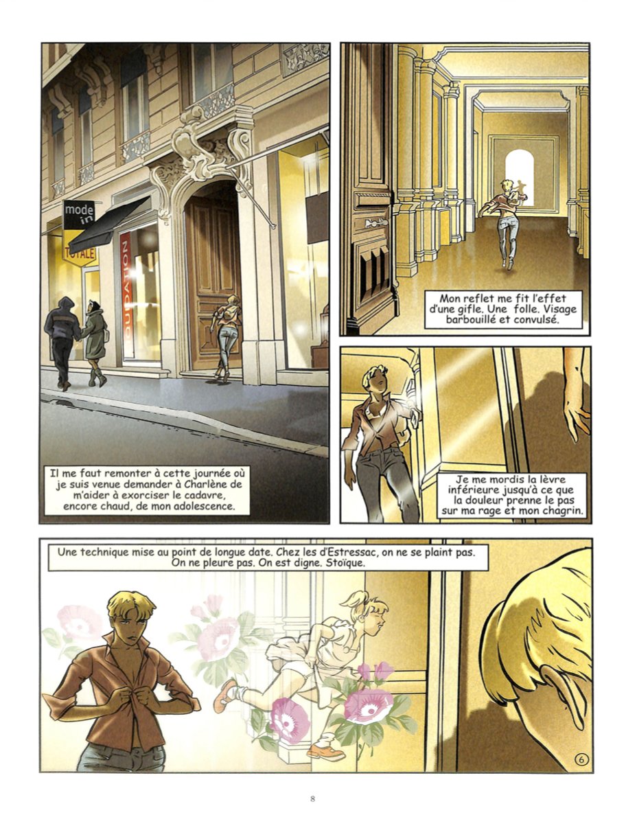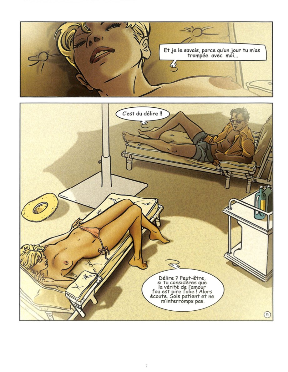 Je serais un chouia moins dur que gruizzli, mais j’ai comme lui trouvé cet album très moyen. C’est très verbeux, avec une sorte de monologue – vaguement entrecoupé de quelques réparties d’autres protagonistes – d’une femme qui, s’adressant à son mari (ou ex-mari, tant la situation semble distendue entre eux deux) d’une femme qui nous raconte son enfance, son éveil aux plaisirs charnels (au sein d’une famille de la haute plutôt vieux jeu), puis sa vie sexuelle et sensuelle (surtout sexuelle en fait), dans ce qui ressemble à une auto-analyse sans grande profondeur. Pas mal de scènes érotiques, sans que ce soit vraiment porno. Pas mal d’ennui surtout. Il ne se passe pas grand-chose, et les atermoiements et autres questionnements de la donzelle masquent mal la vacuité du scénario, alors même que le rythme est d’une lenteur ! Restent quelques jolis dessins (même si le trait un peu gras manque parfois de détails), qui me rendent un peu plus indulgent que certains de mes camarades. Mais l’album est très vite lu (peu de texte, un scénario qui fait le minimum), et tout aussi vite oublier je le crains.