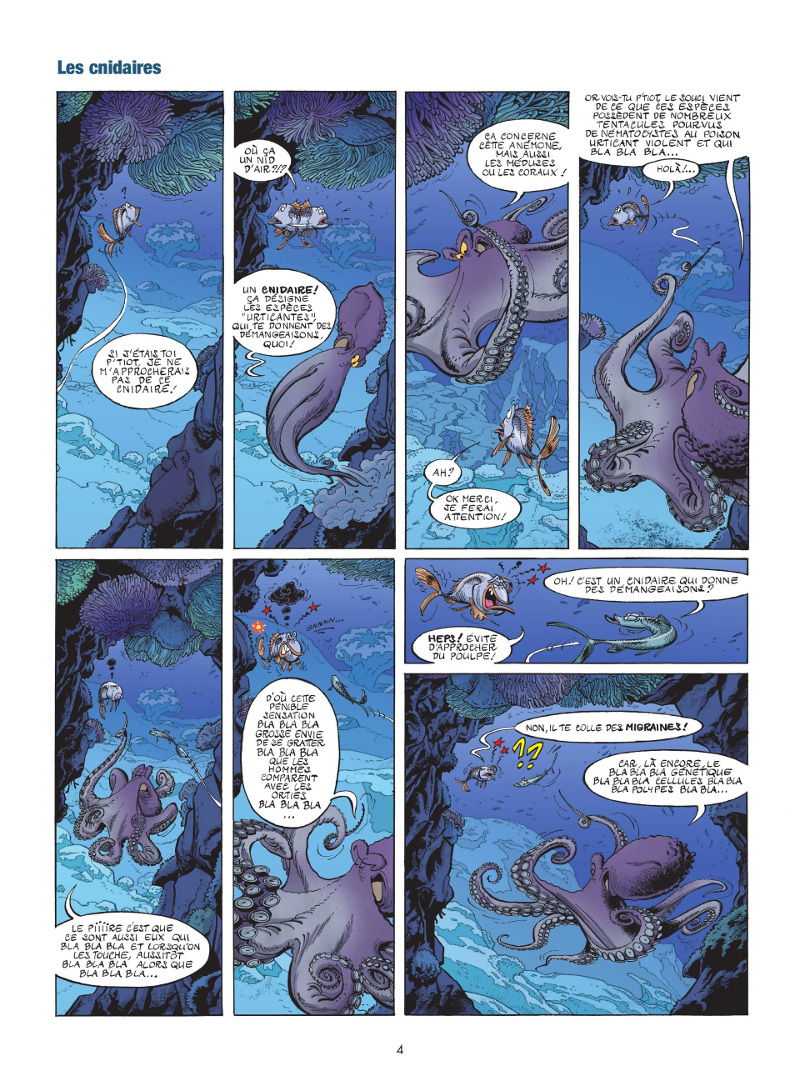 Cette série est dans la lignée des Insectes en bande dessinée et des Dinosaures en bande dessinée chez le même éditeur : il s'agit d'un mélange entre documentaire animalier et gags en une ou deux planches. Comme son nom l'indique, le sujet porte cette fois sur les animaux marins, de la plus petite crevette jusqu'à la plus grande baleine. J'ai sur cette série un avis mitigé. Ce que j'ai aimé, c'est que j'y ai appris pas mal de choses. Les sujets abordés sur tel ou tel animal sont instructifs et parfois assez étonnants. Ce sont en général des anecdotes du type "le saviez-vous ?" et le plus souvent, ben non, je ne le savais pas. Et j'ai trouvé ça intéressant. D'autant que c'est présenté le plus souvent avec un humour agréable en cours de planches, dans les dialogues et autres situations. Le dessin, pour sa part, est plaisant mais sans plus. Il convient bien à ce type de série d'humour, il est fluide sur le plan technique et se lit bien, mais il n'a rien de particulièrement marquant. Par contre, mon vrai souci, ce sont les chutes de ces gags. Je ne crois pas en avoir trouvé la moindre drôle. C'est plat, très souvent prévisible, un peu lourdingue même parfois. J'ai bien plus souri en cours de lecture de planche que sur leurs dernières cases qui m'ont refroidi plus d'une fois. Ça sent la chute forcée, parce qu'il faut absolument faire drôle, comme une grosse tarte à la crème sans intérêt. Ces chutes pas drôles pourraient presque me faire baisser ma note d'ensemble de la série. Mais je préfère retenir son côté instructif, son dessin satisfaisant et l'humour qu'il reste tout de même en dehors des chutes en elles-mêmes.