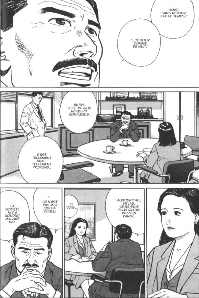 Jirô Taniguchi est un auteur que j'apprécie beaucoup, et lorsque je peux mettre la main sur un "nouvel" album réalisé par ses soins, je n'y manque pas. Le cas est différent ici, puisqu'il s'agit d'une oeuvre de jeunesse (la première ?), réalisée dans les années 80 et forte d'un classicisme forcené. Ayant lu les 4 premiers tomes j'ai en effet pu voir l'influence de grands auteurs de polars noirs américains des années 50. Le héros est un privé désabusé, pas forcément courageux et pas franchement doué non plus. L'intérêt se situe dans ses relations avec les yakuza et les flics, ripoux la plupart du temps, mais aussi dans la relation qu'il entretient à distance avec son ex-femme et leur fille, pas toujours simple. Au pinceau c'est Taniguchi donc, dans un registre plus noir, plus nerveux que celui qu'on lui connaît, à l'époque où son style et sa mise en scène s'apparentaient à celle d'Otomo. Le résultat est loin d'être déplaisant, même si on a du mal à différencier les personnages, habillés et coiffés de façons très proches (c'étaient les années 70...). Une petite curiosité, pour les fans des deux auteurs.