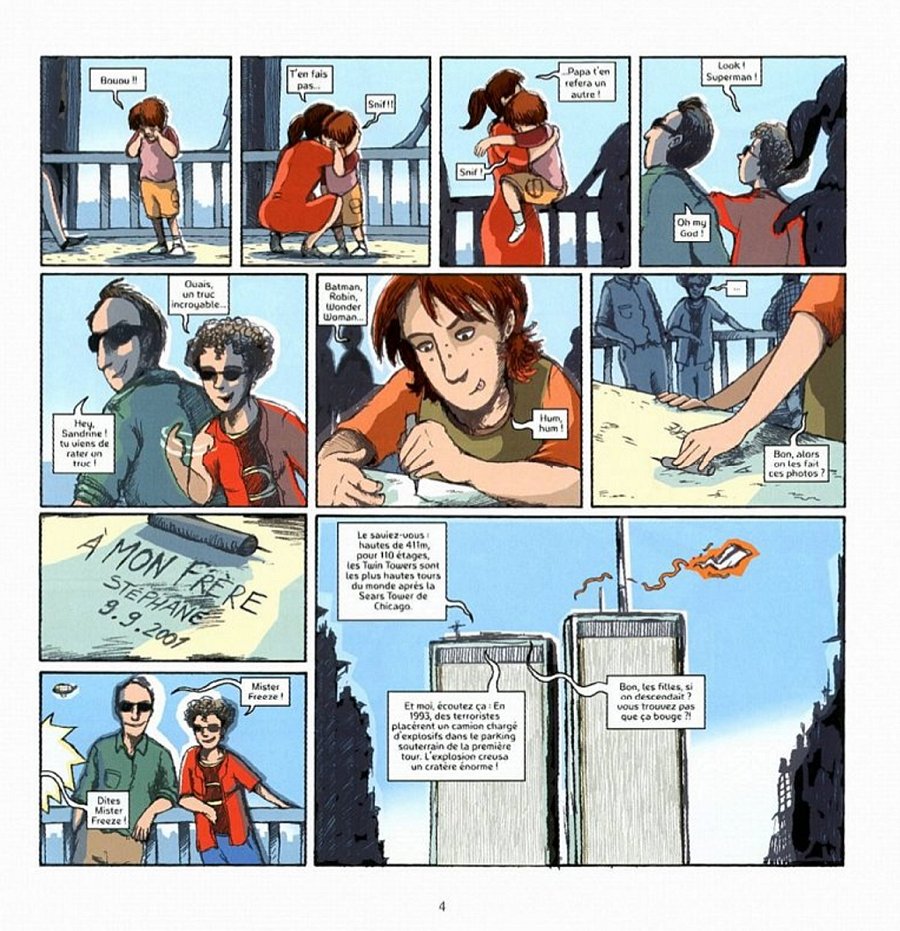 Je n'avais pas aimé Septembre en t'attendant sur le même sujet. Cet évènement a été trop médiatisé pour en sortir quelque chose de nouveau. Ici, l'auteur mélange un problème personnel (perte d'un frère qu'elle voit partout) et le témoignage des attentats du 11 septembre. C'est peut-être ce qui m'a déplu dans ce one shot, car, au final, aucun sujet n'est vraiment traité. Je n'ai pas du tout aimé le dessin et encore moins la colorisation. Rien ne m'a plu, ce qui explique la note sévère. Quoiqu'il en soit, je ne lirai plus rien sur le sujet car je doute qu'il accouche un jour d'une bonne BD.