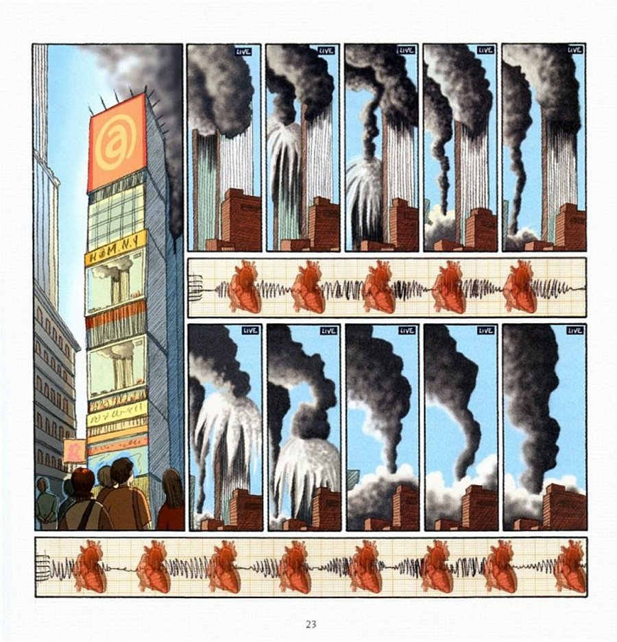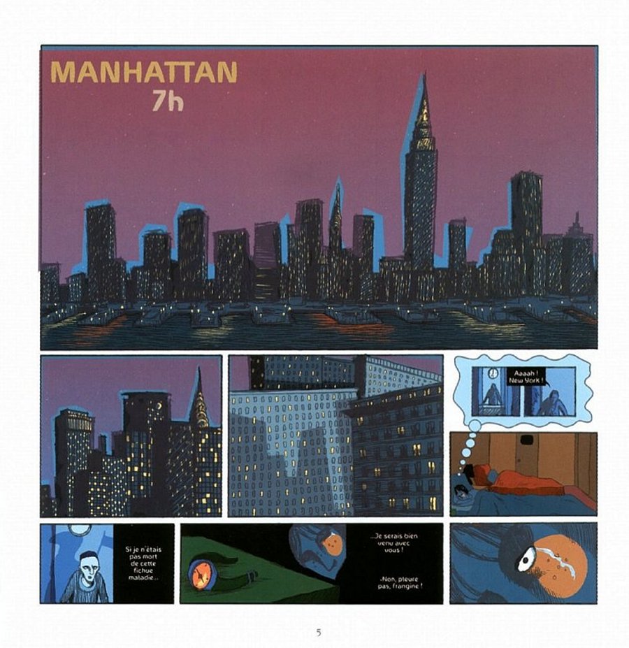 Quel est donc l'intérêt de cette BD ? Non seulement, elle ne m'a rien appris du tout, ne m'a rien fait ressentir ni comprendre, mais en plus, je me suis ennuyé tout au long de sa lecture ! Déjà, moi qui avais beaucoup aimé le graphisme de Un drôle d'ange gardien, j'ai trouvé cette BD plutôt moche ou du moins graphiquement très moyenne. Puis ensuite, l'histoire ne m'a carrément pas intéressé. On ne voit rien, on n'apprend rien, tout ce qu'on voit c'est une suite de larmoiements ("Oh non, c'est pas possible, oh c'est affreux, oh j'ai envie de vomir, comment est-ce imaginable ?", etc, etc...), un parallèle entre les morts du World Trade Center et la mort du frère de la narratrice réalisé d'une manière tellement intime qu'elle ne m'a absolument ni touché ni intéressé, et puis ensuite une suite de petits ennuis représentés comme de grandes catastrophes traumatisantes ("Ciel, des chaînes de télé sont brouillées, oh j'ai envie de vomir, catastrophe il faut attendre notre avion pour repartir", etc...). Pffff... Franchement, j'en soupire d'ennui. Clairement, une telle BD-témoignage aurait eu autant d'intérêt si l'auteur était restée en France et avait raconté ce qu'elle avait pensé en regardant la télé, ça aurait donné tout pareil : "oh non, c'est pas possible, oh c'est affreux, oh j'ai envie de vomir, comment est-ce imaginable ?". Et puis même dans la façon de le traiter, j'ai trouvé ça raté (le coeur qui bat à chaque case : ça ne m'a en rien permis de ressentir l'émotion du moment, le fantôme du frère : mouairf..., les images qui s'intercalent avec des textes genre "tu es poussière et tu retourneras poussière" : j'en ai les épaules qui s'abattent dans un soupir de dépit...). Franchement ennuyeux et n'apportant rien à mon avis.