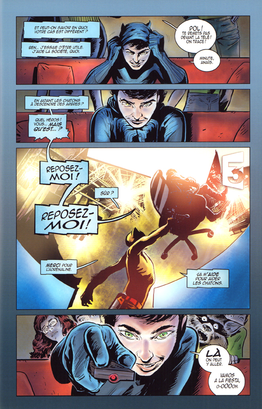 L’esprit qui se dégage du dessin et de l’ambiance générale, les premières péripéties avec un super héros qui se rate complétement m’ont tout de suite fait penser à l’excellent Kick-Ass. Pourtant on n’a pas juste une déclinaison « à la française », mais bien une histoire de super héros à part entière. Celle d’un ado qui va se découvrir des pouvoirs et apprendre à vivre avec. Cette série démarre bien, le ton y est plutôt léger, il y a par exemple quelques pointes d’humour dans le dessin ou dans les détails qui sont assez bienvenu. Le découpage du récit en différents chapitres est plutôt lui bien fichu. Introduction puis flashback permettent de découvrir peu à peu un garçon plutôt attachant. Il faut reconnaitre que c’est quand même original et amusant de voir évoluer un super héros en plein cœur de la Bretagne. La suite prend une dimension qui met plus en scène le coté justicier de Fox Boy. Il y a un personnage, celui du mystérieux ange gardien du premier chapitre, qu’on ne revoit pas mais qui m’intrigue au plus haut point. Donc au final on a assez envie de savoir ce que la suite réserve à notre jeune héros. Et puis une BD de super héros dont le héros s’appelle Pol mérite bien un coup d’œil :)