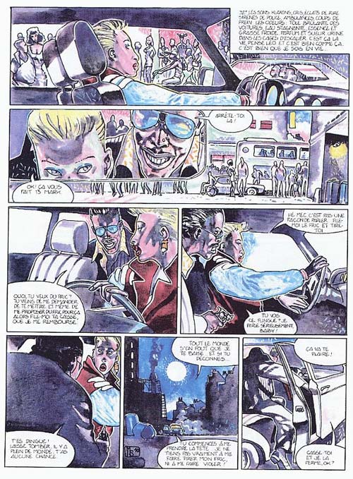 Ma première lecture d'une Bd de Schulteiss fut Le Rêve du requin dans l'Echo des Savanes, autant dire que ça met de suite en condition et que ça permet de supporter un peu mieux un dessin toujours aussi agressif et aux couleurs explosives ; c'est comme ça que j'ai pu lire ensuite Guerres froides ou encore Sois vicieux, mais ce dessin est vraiment très space, je ne l'ai jamais aimé. En dégotant encore cet album dans une brocante en plein air pour 3 euros, je me suis laissé tenter, je n'aurais peut-être pas dû, mais bof après tout, faut bien être curieux parfois... C'est une sorte d'errance nocturne d'une femme chauffeur de taxi, confrontée à des personnages interlopes et sinistres, ce genre de récit n'est pas nouveau, ça a été vu souvent en BD, je me souviens d'une Bd érotique de Jacobsen, Lou taxi de nuit qui était bien plus imaginative et nimbée d'un humour trash propre à cet auteur. Ici, je n'ai pas particulièrement apprécié ce récit, avec cette histoire d'amulette qui ne mène nulle part, et je ne vois pas ce que vient faire sette série de meurtres qui n'apporte rien à l'intrigue principale, c'est parfaitement inutile. Voila donc encore une Bd que j'échangerai sans regret dans une de mes boutiques d'occase.