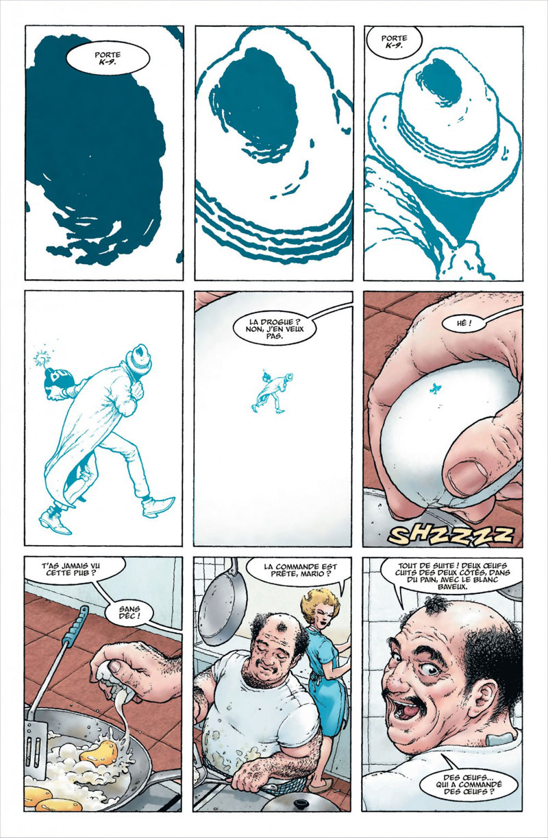 J’ai abandonné en cours de route la lecture de cet album, trop sombre, trop confus et trop délirant à mon goût. Je voulais pourtant y croire et l’idée de départ me semblait propice à un gros délire bien bourrin et amusant. Malheureusement, excepté dans de très rares passages, cet album n’a rien de drôle. On passe d’un super héros -pourtant grotesque dans son apparence et son langage- lancé dans une aventure absconse voire totalement incompréhensible aux délires d’un artiste en pleine crise de délirium tremens/parano/pleurnicherie. Les deux récits sont bien entendu liés (l’artiste étant en fait le créateur du super-héros) mais ce récit est tellement confus, son histoire est tellement tordue et les pleurnicheries de l’artiste (en conversation téléphonique avec un service de prévention du suicide alors qu’il semble camé jusqu’aux yeux et que ses propos sont loin d’être cohérents) sont tellement répétitives que j’ai fini par lâcher prise. Pourtant, derrière ce délire, Grant Morrison dévoile tout son amour des comics et des super-héros à l’ancienne. Malheureusement, sa came n'est pas la mienne et il n'a pas réussi à me faire aimer ses personnages. Côté dessin, ça va. Ca va même mieux que pour beaucoup d’autres comics, à mes yeux. En fait, on peut même dire que Franck Quitely livre un travail de qualité, avec des planches très fouillées et truffées de petits détails qui démontrent tout son talent. Mais, bon, quand les intentions des auteurs me laissent de marbre, quand je ne m’amuse pas à lire leurs délires, quand le sort des personnages m’indiffère, je ne vois aucune raison objective de poursuivre ma lecture.