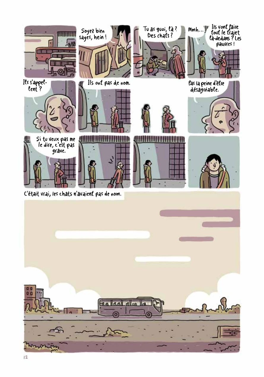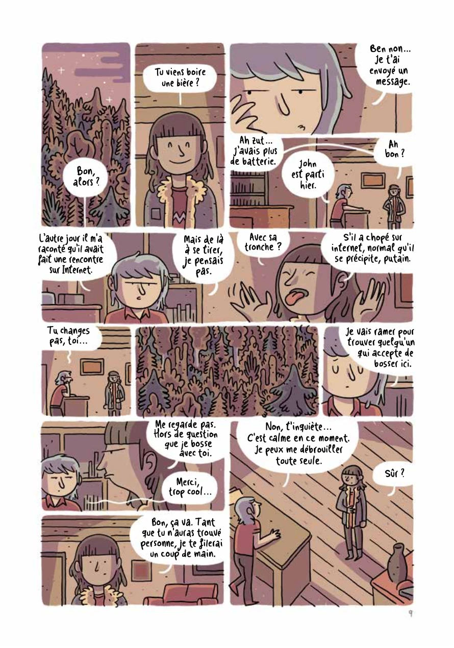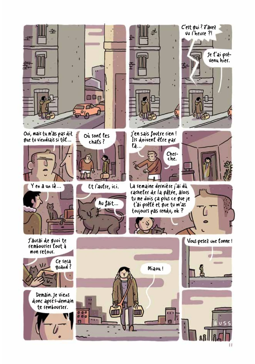 Houlà que c’est glauque ! Toute la force de l’album réside dans l’antinomie qui oppose un trait et une narration innocentes d’aspect à un thème glauque et sordide. En effet, quand on regarde distraitement le dessin d’Alvaro Ortiz, on se croirait presque dans un album de Guy Delisle ou –mieux encore- de Michel Rabagliati. Et cette sensation est encore accentuée par la narration très « roman graphique d’un quotidien sans intérêt » employée par l’auteur, n’hésitant à directement faire dialoguer son personnage central avec nous, lecteurs. Le gars en question vend des chats, a une histoire d’amour avec la gérante d’un motel, devient copain avec un type un peu bizarre, rêve d’écrire un roman qui le rendra célèbre mais dégage surtout une image de jeune mou glandouilleur. Rien de bien dangereux de prime abord. Le récit en lui-même est des plus sordides puisqu’il sera question de chats qui mangent des cadavres, de tueurs en série, de carnages inexpliqués, de collections malsaines… Vraiment glauque en soi mais tout cela passe comme une lettre à la poste grâce au ton employé. A titre personnel, à cause de plusieurs moments creux à mes yeux, je n’aurais pas conseillé l’achat s’il n’y avait eu un final franchement plaisant. Mais grâce à celui-ci et à l’originalité de l’approche du thème développé, j’opte finalement pour un 3/5 avec achat conseillé.
