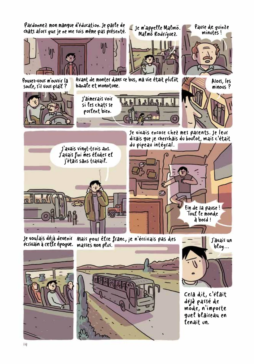 Malmö Rodriguez a vingt trois ans il glande chez ses parents et se rêve écrivain. Après le décès de son oncle, il recueille ses chats et entreprend un long voyage avec eux. Les chats que transporte Malmö sont destinés à un collectionneur d'objets ayant été en relation avec des meurtres sordides. Il faut dire que les chats ont bouffé l'oncle de Malmö. Dans le village où vit le collectionneur, Malmö va peu à peu sympathiser avec le collectionneur et découvrir sa fibre littéraire... entre autres choses.