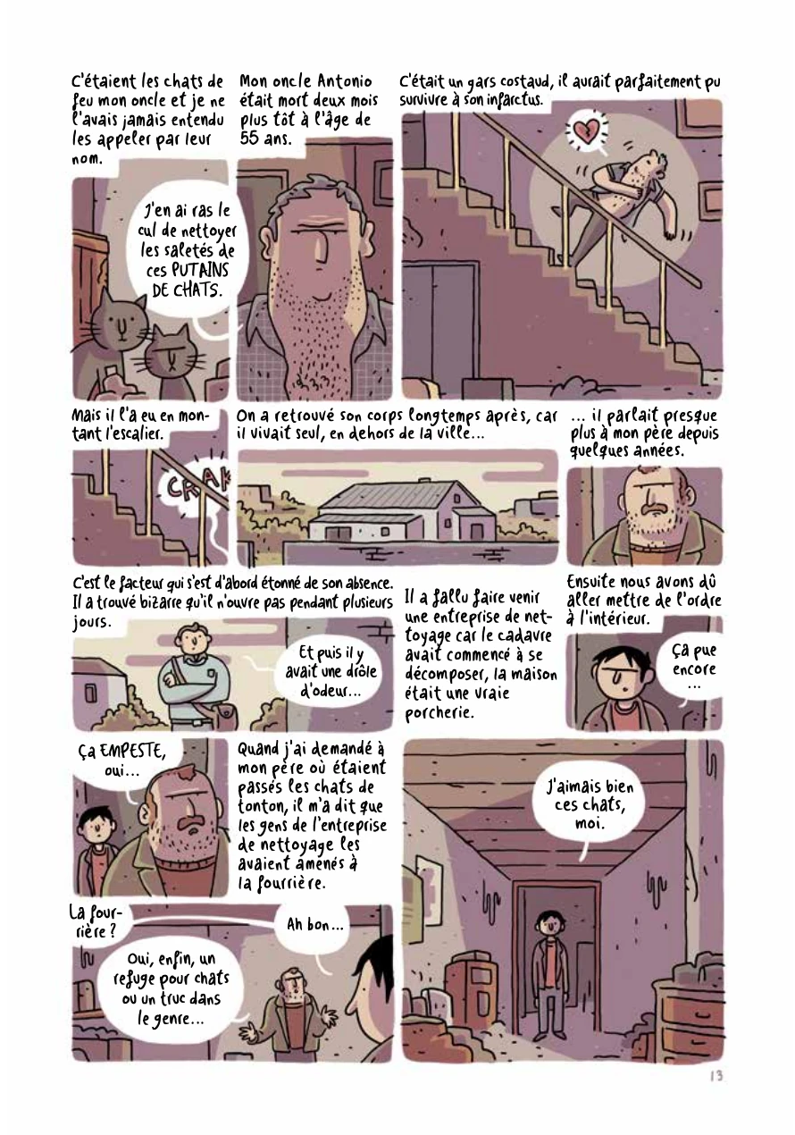 Au début, je pensais que l'histoire allait être un banal roman graphique sur un type qui essaie d'être écrivain, mais très vite je me suis rendu compte que ce n'est pas le cas. La vie du héros bascule lorsqu'un de ses oncles meurt et que ses chats lui bouffent le corps. Le héros se rend compte qu'il y a des gens qui seraient prêts à payer pour avoir ses chats et il va les vendre à un type qui a une collection sur les tueurs en séries. Le héros va rester dans le coin, trouver un boulot et une copine et il va devenir ami avec le collectionneur et s'intéresser à sa collection. Au fil des pages il va y avoir des révélations surprenantes. L'intrigue est bien construite et je l'ai trouvée passionnante à lire. Il y a des bonnes surprises dans le récit. Le héros est attachant, la collection du vieil homme est intéressante (surtout que l'auteur donne des informations sur des tueurs en séries célèbres) et les chats sont mignons (je n'aurais aucune objection à ce qu'ils mangent mon cadavre). Le dessin est sympathique.