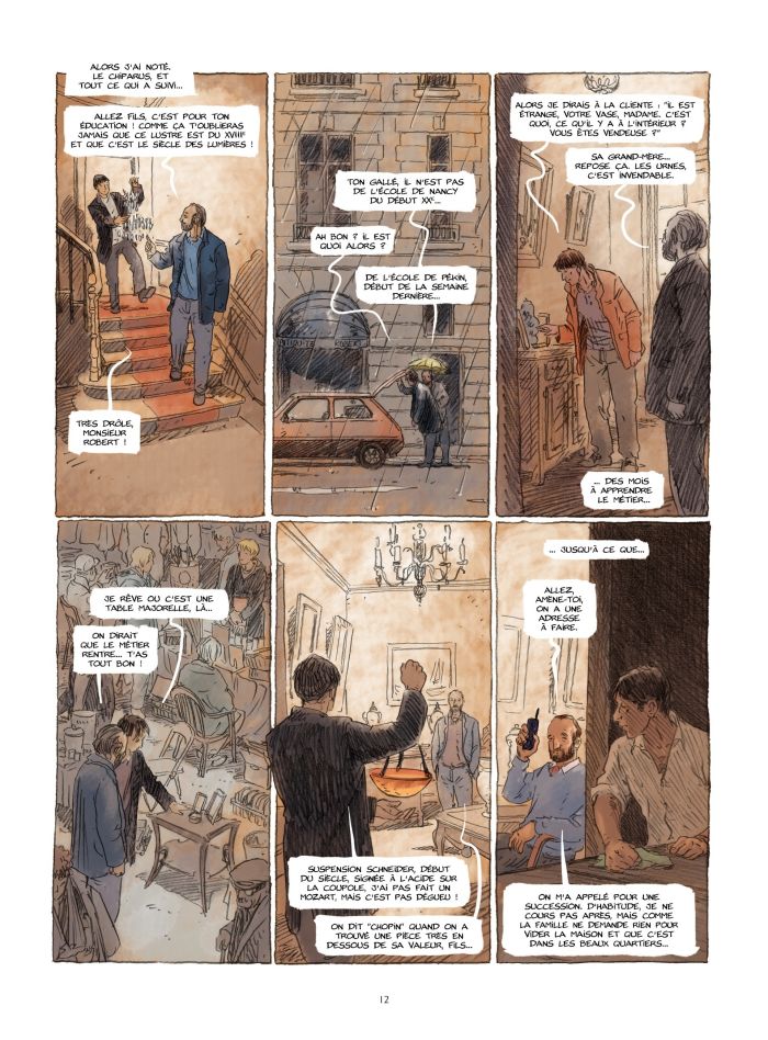 La quatrième de couverture parle d’ « une enquête passionnante dans le monde impitoyable de l’art et de l’expertise des œuvres ». Je dois dire que, si le sujet m’intéresse a priori, la promesse n’a pas été tenue, loin de là. En effet, l’enquête en question est menée de manière presque dépassionnée, sur un rythme assez lent, et surtout sans que Hervé Richez ne ménage de suspens, de surprise dans son « scénario ». Alors, certes, c’est censé être la retranscription d’une histoire vraie. Mais la justification d’en faire une bande dessinée serait d’y ajouter du vivant – sans pour autant trop romancer. On se contente ici de suivre les étapes de la reconnaissance d’un tableau comme étant un vrai Degas. C’est à peine si l’on perçoit, au travers de quelques allusions, que cette quête a bouffé la vie de Stéphane (le personnage principal), et miné les relations qu’il entretenait avec sa femme. Reste qu’on apprend quelques infos sur le marché de l’art et « l’authentification » des œuvres (le court dossier de fin d’album est plutôt intéressant). Mais c’est globalement décevant.