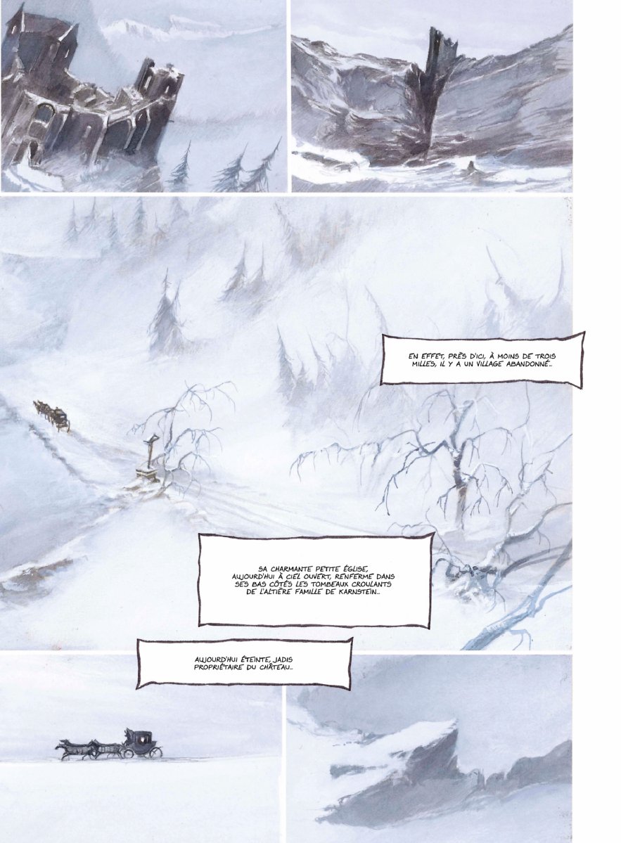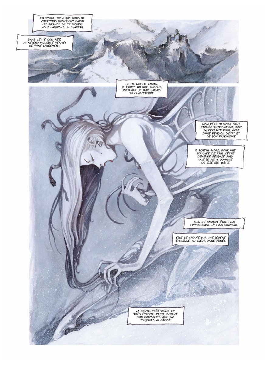 Après Dracula et Erszebet Bathory, Pascal Croci s'attaque à une autre figure de la littérature vampirique classique, Carmilla, héroïne de la novella éponyme de Joseph Sheridan Le Fanu. Mais Croci choisit de ne pas adapter de manière fidèle le roman, et l'adapte plutôt librement, le changement majeur étant la figure de Carmilla. Il en fait une cousine de Laura venue vivre quelques temps auprès d'elle, la rendant encore plus proche (et plus insoupçonnable ?) que la Carmilla du roman. Il occulte également l'action de Carmilla sur le voisinage, se concentrant sur le château Karnstein. Pour le reste le cheminement est proche : la pâleur et la fatigue progressives de Laura, l'emprise grandissante de sa confidente... Le charme du style crocien opère : des ambiances languissantes et langoureuses, des décors enneigés, mornes et oppressants, des visages maladifs et mutiques... La maîtrise graphique est un peu plus grande à chaque album, et le plaisir est là, pour peu que vous soyez amateur de ce style. A lire.