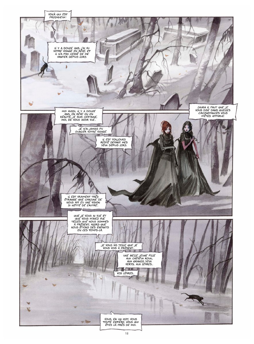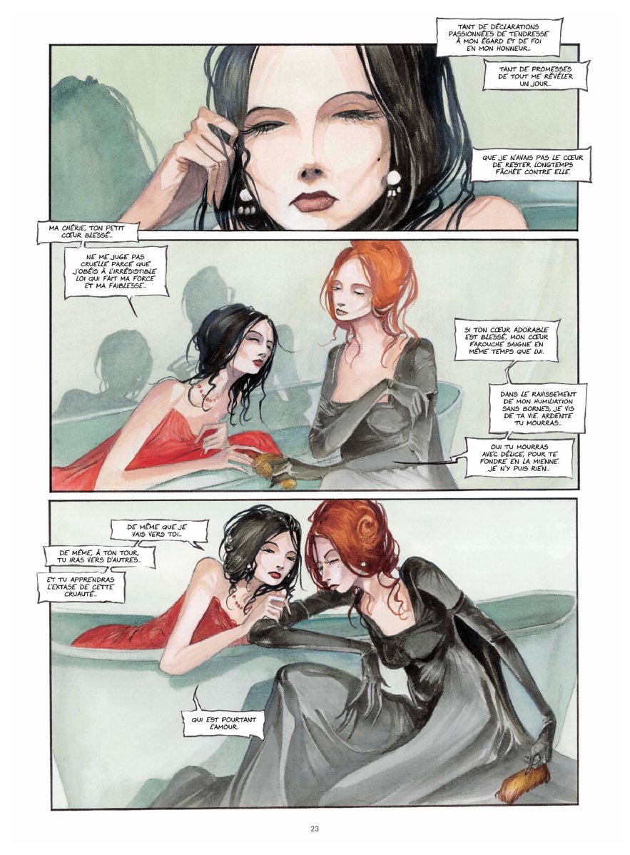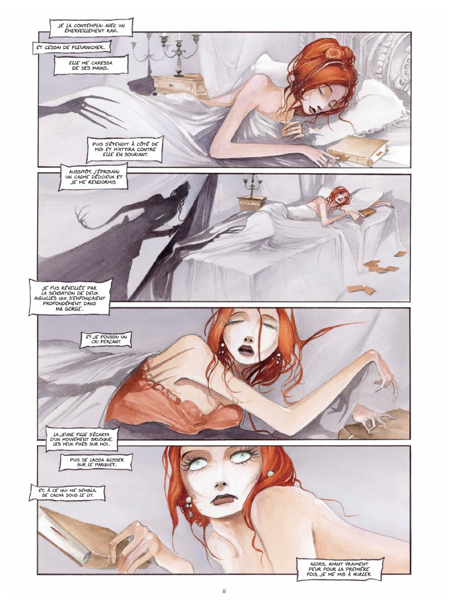 Cette Bd ne m'a pas autant intéressé que je le pensais, ça m'a même ennuyé à la limite ; déja quand j'étais ado, j'avais essayé de lire le bouquin de Sheridan Le Fanu qui est un classique de la littérature gothico-romantique et vampirique, et je me souviens que ça ne m'avait pas interpellé. Pascal Croci était me semble-t-il tout désigné pour traduire ce conte gothique en images, même si je ne suis pas fan de son dessin ; ses femmes sont toujours dessinées selon le même style, un peu comme Crepax, avec de longues silhouettes aux grands yeux, au teint blême et à l'air toujours triste, dans une ambiance morbide et blafarde. Sur Elizabeth Bathory, ça m'avait grandement surpris et pas plu du tout, ici, c'est plus réussi, plus travaillé... ah c'est beau, il y a une élégance du trait, c'est indéniable, ça donne des pages à l'aspect contemplatif, mais ça ne me convient pas. Les errances romantico-saphiques de ces 2 femmes ne m'ont vraiment pas passionné, c'est une Bd qui n'est pas pour moi.