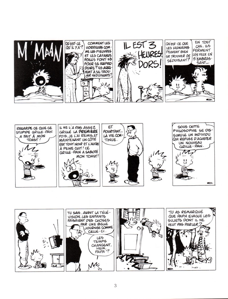 Une BD superbe, subtile et souvent très drôle, malgré un dessin parfois peu figuratif. Peu de personnages secondaires. L'imagination presque sans limites de Calvin remplit les scénarios la plupart du temps.
