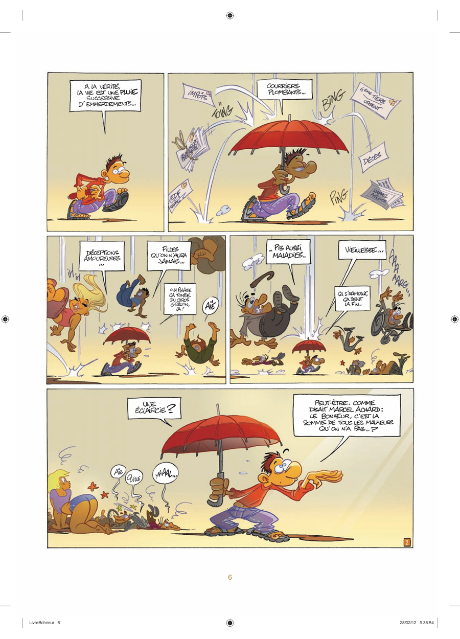 Note : 1,5/5 Cet album n'est pas exactement comme les autres albums humoristiques grand public de Jim (La Flemme, Le Désir, La Honte, etc...). Ici ce ne sont pas des gags en une planche mais une histoire complète qui est mise en scène, racontant les pensées et bavardages d'un gars qui se trouve déprimé, s'interroge sur le bonheur et qui va découvrir et parcourir les conseils d'un livre grand public destiné à donner des conseils pour être heureux. Par ce biais, après avoir donné une vision superficielle de ce qu'est la mauvaise humeur et le minimum syndical du bonheur, l'auteur a la possibilité de nous présenter successivement une liste de petits conseils et réflexions philosophiques sur comment trouver le bonheur simplement. Mais tout cela m'a paru franchement cheap et facile. Le graphisme est réduit à son strict minimum. Un personnage moche dans un décor totalement vide, le tout colorié à l'informatique avec gros dégradés hideux. Parfois quelques autres personnages d'aspect basique, un décor ou un bout de décor par-ci par-là, et emballé c'est pesé. Pour le reste, c'est uniquement du blabla avec des tentatives de ce qui semble parfois vouloir s'apparenter à de l'humour mais niveau tarte à la crème. L'idée semble d'en profiter pour diffuser quelques idées philosophiques simples sur le bonheur mais au-delà des quelques concepts vraiment évidents entrecoupés de faux concepts à destination humoristique, on a très vite fait le tour et on n'apprendra pas grand chose. Et l'ensemble est mis en scène de façon lourdingue et pas drôle du tout avec un héros sans aucun charisme. Je n'ai pas mis la note minimale car il y a quelques notions de bonheur simple qui ne sont pas fausses, mais dans l'ensemble, je n'ai pris aucun plaisir à la lecture de cet album que je ne recommande pas.