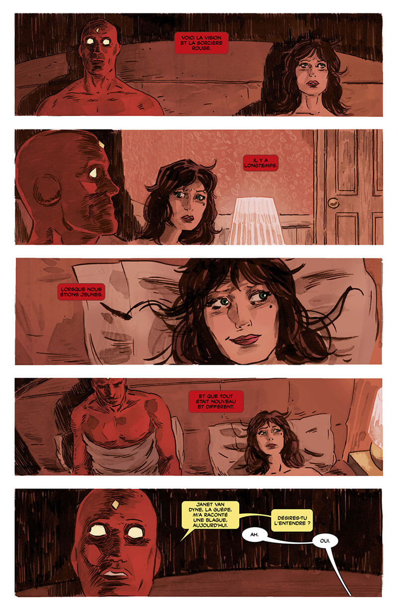 L’Avenger Vision a décidé de fonder une famille. Le synthézoïde a décidé de la créer de toutes pièces et d’emménager en banlieue. L’intégration va s’avérer plus compliquée que prévue et les secrets vont venir peser sur l’ambiance de la petite famille. Texte: L'éditeur