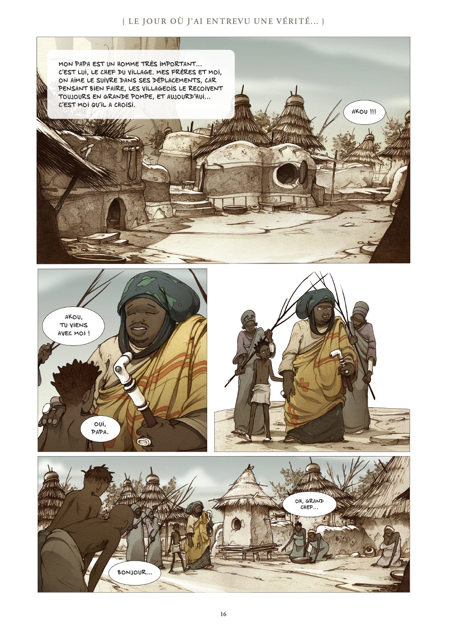 La lecture de cet album est plutôt sympathique. J’ai souvent eu l’impression de lire une sorte de « Kirikou » plus adulte, plus mature, mais avec la même fraicheur. L’histoire assemble plusieurs petites fables, où l’humour joue son rôle, le tout nous faisant découvrir un village, sa vie, et en particulier un personnage, d’abord jeune, puis vers la fin, au moment de son passage à l’âge adulte, lorsqu’il est question qu’il remplace son père comme chef du village. La narration est fluide, très agréable, on baigne dans un univers d’Afrique noire traditionnel, visiblement de la région du Sahel. Même si les paysages semi-désertiques, le sable dominant et la tension autour du manque d’eau apportent une certaine menace lancinante, il se dégage de l’ensemble quelque chose de frais et d‘optimiste. Quant au dessin, il est très chouette. Lui aussi fluide, clair, dynamique, il accompagne très bien ce récit que j’ai lu avec grand plaisir. Note réelle 3,5/5.