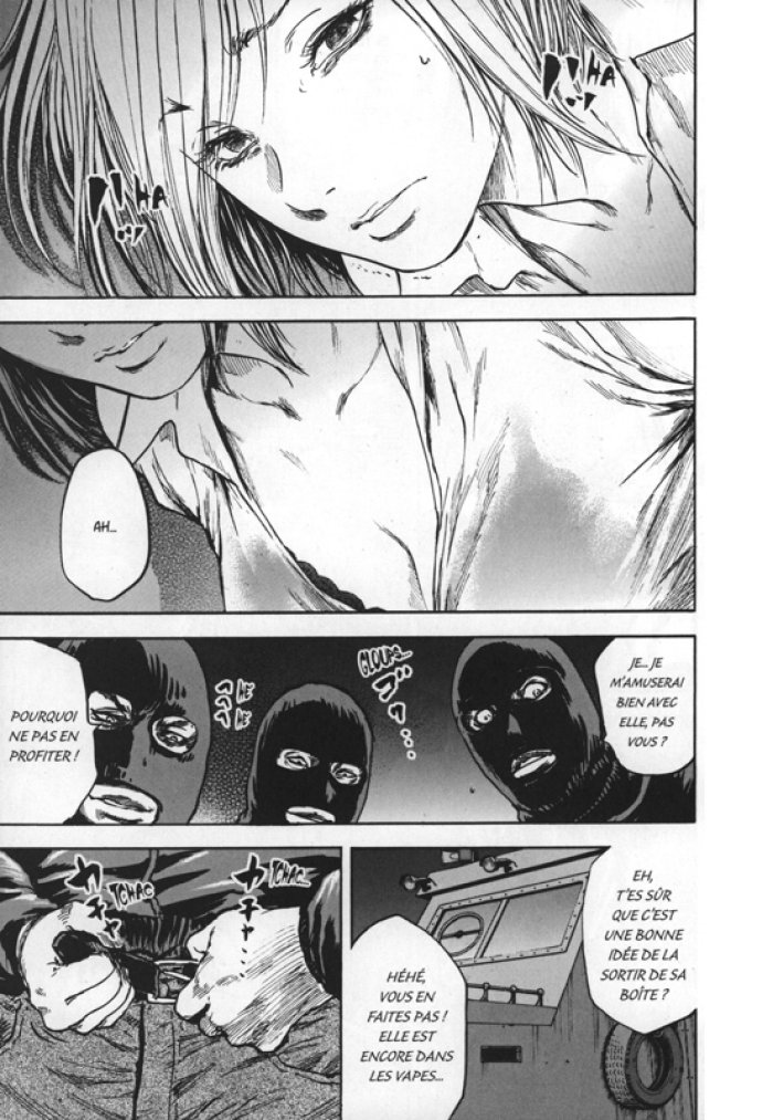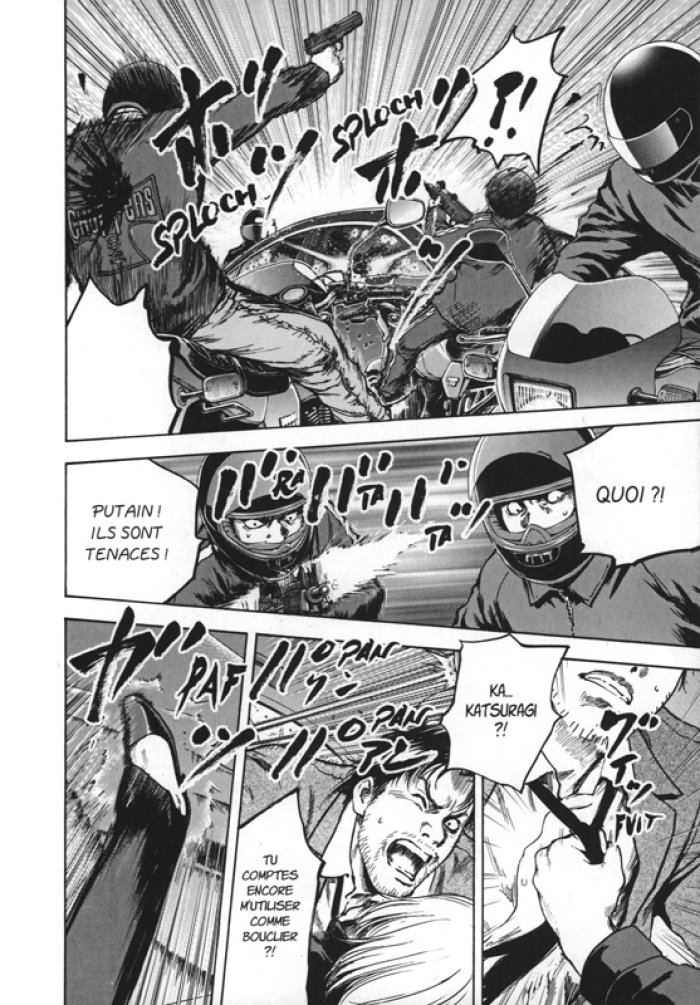 Outch ! Pas du tout ma came ! Et, indépendamment des goûts de chacun, je crois pouvoir dire que c’est mauvais. Bon, en tout cas, j’avais emprunté les quatre tomes, et je n’ai finalement fini – et encore péniblement – que les deux premiers. Je vais arrêter là les frais, tant cette histoire me saoulait. D’emblée certains détails m’ont mis de côté. D’autant plus qu’ils sont devenus récurrents. L’héroïne, une jeune policière un temps envoyée travailler aux Etats-Unis, puis qui retourne au Japon avant la fin du premier tome, est hautement improbable. Elle utilise un flingue muni d’un silencieux, dézingue à tout va, et personne, y compris sa hiérarchie ne semble s’en émouvoir. Et lorsqu’elle n’a pas son flingue avec silencieux (on ne sait pourquoi il lui a un temps été confisqué, même si elle continue à mener ses enquêtes officiellement !), elle arrive à entrer chez un gros chef de gang avec une arbalète (très discret et crédible donc – ce qui lui permet là aussi de s’en sortir). A côté de cette pin-up à silencieux – qui au passage n’hésite pas à donner de sa personne pour ses enquêtes – nous avons un autre flic, encore plus caricatural : gros beauf vulgaire, misogyne, qui met des mains au cul et qui plote à tout va parmi ses collègues (ce qui ne provoque pas trop de réaction, à part quelques froncements de sourcils), qui trafique et s’en vante devant sa hiérarchie, faisant le fier à bras. Au bout d’un moment, j’attendais les signaux me montrant que j’avais raté le fait que c’était du énième degré comique. Mais non, c’est du bourrin premier degré vulgaire. Quant aux scènes de baston, c’est du style manga que je n’apprécie déjà pas. Alors comme l’intrigue – vraiment sans nuances ! – et les personnages pas crédibles me rebutaient, je m’arrête donc en cours de route.