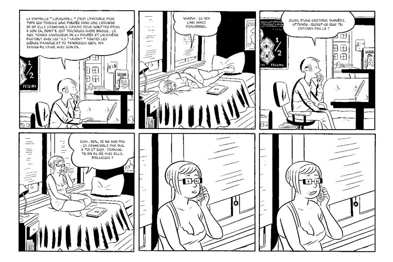 Peter et Miriam, c'est l'histoire de deux amis d'enfance au caractère plutôt marqué. Ils se connaissent depuis qu'ils ont 7 et 8 ans. Et vingt ans plus tard, le premier est étudiant en cinéma tandis que la seconde est en école d'art et dessine des bandes dessinées. C'est le récit décousu de leur relation, passant d'une époque à une autre, d'un contexte à un autre au gré des chapitres : le jour de leur rencontre, une interview d'un cameraman expérimenté que Peter veut réaliser avec l'aide de Miriam, une séance de cinéma ensemble, et d'autres moments de leur vie ensemble ou séparés durant cette vingtaine d'années. Le dessin me fait fortement penser au style de Daniel Clowes (Ghost World) en un peu plus lâché, moins soigné. On y retrouve une même ambiance underground américaine, avec des personnages un peu amorphes et des décors froids aux traits géométriques. Pour faire simple, je dirais que tant graphiquement qu'au niveau de l'histoire, on est dans l'atmosphère d'un film d'art et d'essai racontant l'histoire intime de deux protagonistes pour mieux observer leur caractère. Mais concrètement, il ne se passe rien. Les plus de 100 pages pages du tome 1 ressemblent à une grande introduction pour nous présenter vaguement les personnages. On comprend que Peter a un caractère assez colérique et facilement dominateur. Et que Miriam s'en contente parce qu'elle aussi a son petit caractère et aime l'excentricité de son ami. On comprend aussi que Peter est cinéphile et qu'il aime découvrir de vieux films de grands réalisateurs. Mais à part ça, c'est plutôt barbant. Les deux personnages ne sont pas attachants du tout. Enfin Miriam pourrait peut-être l'être mais on n'en apprend que très peu sur elle pour le moment. On ne voit pas vraiment ce qui a permis de les rendre amis depuis si longtemps. Et il n'y a pas de véritable histoire, pas de fil rouge auquel s'accrocher. C'est ennuyeux. Et il semblerait que ce soit un avis partagé par d'autres car, suite au tome 1 paru il y a maintenant 9 ans, il n'y a pas de nouvelles à priori d'une suite en cours de réalisation.