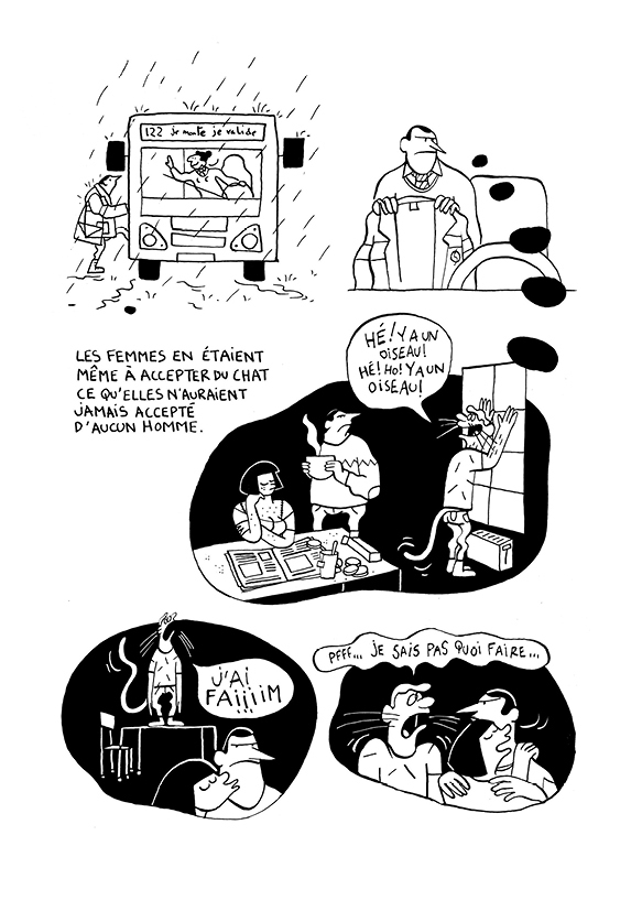 Malgré une pagination relativement importante, la lecture est assez rapide, car il y a peu de texte – et surtout pas de cases (ni de décor) à explorer. Le dessin d’ailleurs n’est pas forcément extraordinaire, mais cela passe ici. Le point de départ est assez humoristique, farfelu, puisqu’un homme se met à haïr les chats, à les exterminer, les estimant à la base d’une certaine forme de féminisme (voir le jeu de mots du titre) ne permettant pas à l’homme de s’attirer les faveurs des femmes : le chat est un concurrent déloyal. C’était jusqu’à ce qu’il tombe amoureux de Roxanne, et surtout qu'il rencontre son chat Topaze, ou plutôt Igor… Et là, le côté loufoque prend vraiment le dessus, et l’histoire part complètement en vrille – avec quelques parallèles avec certaines périodes noires de l'histoire du XXème siècle ! C’est donc un rire jaune qui domine ensuite. L’histoire se laisse lire agréablement, sans être extraordinaire. Mais il y a suffisamment de petites idées, de rythme, pour qu’on aille au bout sans se poser de question. A emprunter à l’occasion.