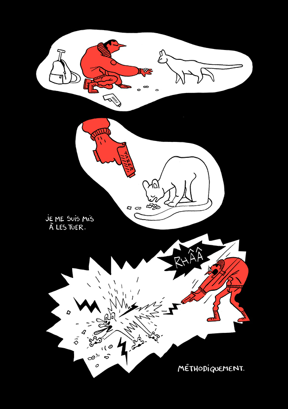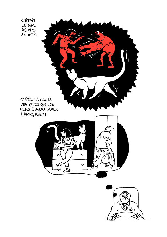Au début jai cru à une variante du charmant petit ouvrage de Nancy Peña Madame où la maîtresse devient vite esclave de son félin. Nous dérivons ensuite vers de la loufoquerie de chat russe, style Kochka de Duhamel/Brrémaud avec une violence implicite assez dérangeante . Un dessin minimaliste accompagné d'un scénario délirant , cela aurait pu convenir sur quelques strips mais ici je trouve que cela passe moyennement. Ce type de dessin passe bien quand il est accompagné par une punchline mais autrement je m'en lasse vite. Est-ce un exercice de style graphique qui reprend l'idée d'une sorte d'invasion genre peste avec des chats ? Heureusement cela se lit très vite mais s'oublie tout aussi vite.