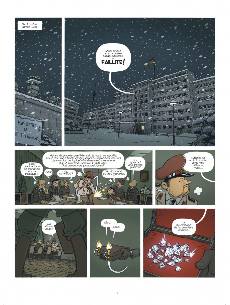 En 1989, à Bruxelles, il faut croire qu'il ne se passe pas assez de choses pour remplir les unes des journaux. En tout cas, Fantasio est incapable de trouver "LE" scoop dont son rédac-chef a désespérément besoin. Alors quand il apprend que le comte de Champignac est invité à un congrès de mycologie se déroulant à Berlin-Est, il le prend comme une merveilleuse opportunité de raconter le rapprochement des peuples. Mais le comte ne le voit pas de cet oeil et refuse tout net d'y participer. Après avoir ruminé quelque temps sa déception, Fantasio décide de retourner convaincre ce scientifique aussi génial que buté... qui semble avoir disparu en plein milieu de la nuit. Spirou et son compère comprennent rapidement qu'il a été embarqué malgré lui en RDA et vont se mettre sur sa piste. Mais traverser la frontière la plus protégée d'Europe ne va pas être facile. La Stasi, police politique de la dictature communiste, veille au grain. Et l'ombre d'un vieil ennemi plane sur Berlin coupée en deux.