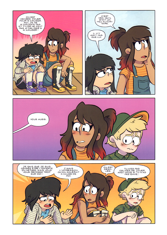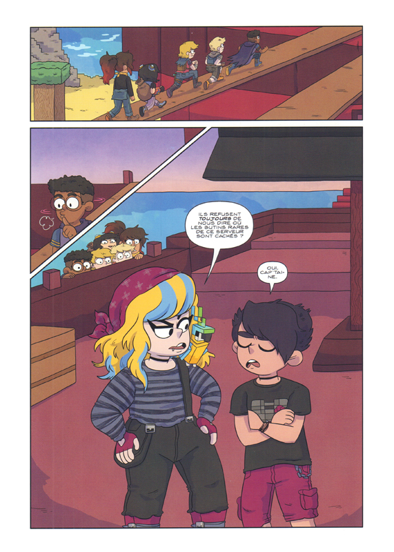 Cela fait pratiquement 7 ans que je suis une véritable fan de l’univers Minecraft avec tous ses cubes, ses monstres cultes tel que le creeper et des serveurs avec des mini jeux plus amusants les uns que les autres. J’ai été curieuse de voir cet univers en format BD. Alors déjà premier point il n’y a aucune explication pour les gens ne s’y connaissant pas à Minecraft, on vous balance des tas de noms de monstres, vous risquez sûrement d’être un peu paumé au début de la BD. L’histoire raconte celle d’un garçon d’environ 14 ans nommé Tyler qui a déménagé à l’autre bout du pays et qui se retrouve dans une école assez stricte. Les week-end il retrouve son ancienne bande de potes sur Minecraft. J’aime beaucoup comment la Bd explique que les jeux vidéos ne sont pas forcément une mauvaise chose et oui, grâce à eux certains peuvent rester en contact malgré la distance qui les sépare. J'ai vraiment l’impression que c’est un des petits messages que la BD voulait faire passer aux parents, si des parents la lisent, car oui le scénario est vraiment très enfantin, alors il se lit de manière agréable et sans prise de tête mais ne vous attendez pas à un grand scénario digne d’un Tintin par exemple, on est clairement dans une BD pour un public entre 8 et 14 ans. Les dessins sont vraiment bien fichus, les décors sont très beaux. La chambre de Tyler est par exemple remplie de petits détails très sympathiques qui font plutôt vrais. Les décors minecraftiens du serveur sont aussi très joliment représentés. Mais petit détail étrange, ce sont les personnages, ils ne sont pas carrés... pour une adaptation de Minecraft c’est assez étonnant, mais bon ils sont expressifs et mignons donc on va passer outre ! Mais pour moi le plus grand point positif sont les personnages. J’ai surtout aimé le duo des deux filles, attachantes et mignonnes ensemble, elles sont aussi très dynamiques ! Tyler est lui aussi très intéressant. En effet il est le plus doué en combat des deux pour ce qui est des garçons, Evan est sympa avec un bon design, mais Tobi quant à lui est assez passable, aussitôt vu, aussitôt oublié .... Il fait quelques gags mais rien de folichon, il est le personnage de trop dans la bande pour moi, je ne me souviens même pas d’une réplique qu'il aurait pu dire. Mais sinon la fin est cool, surtout un petit détail qui m’a plutôt surprise dans le bon sens ! Le monde commence à être plus ouvert c’est bien. Pour conclure, une bonne petite BD, des bons personnages, mais un scénario un peu trop enfantin. Le tome 2 est maintenant sorti, je l’ai acheté très récemment et je l’ai aussi beaucoup apprécié, y’a des thèmes abordés comme le harcèlement même si ça tombe des fois dans le cliché.