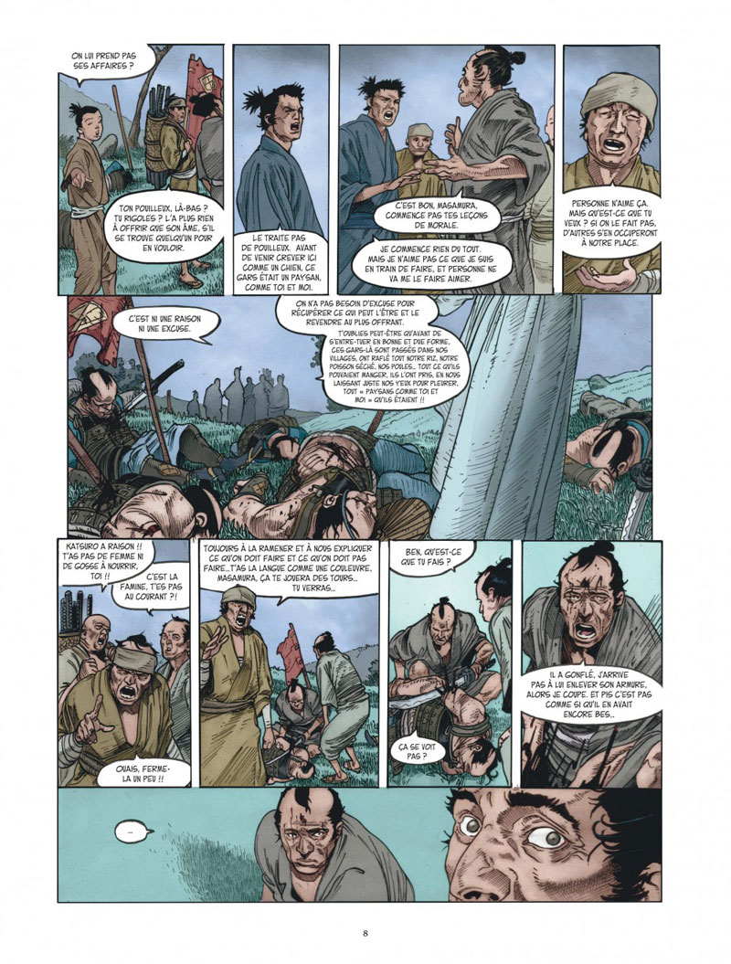 De Chauvel, je connais surtout les séries d’aventures, et particulièrement dans l’univers du polar. Ici, c’est dans un univers historique exotique, dans une sorte de Japon médiéval fantasmé (plus médiéval que fantastique pour le moment d’ailleurs !), qu’il développe son intrigue. Après un départ un peu lent et classique, nous accrochons le wagon des deux protagonistes qui vont nous guider dans l’histoire : Sadakio, qui vient de perdre son mari à la guerre, et Masamua, paysan pillard qui s’est joint à celle dont il est tombé amoureux (ce qui n’est pas réciproque – du moins pour le moment). C’est que la jeune femme doit partir chercher le masque aux mille larmes, capable de faire revenir son défunt mari. Les deux personnages – dont les liens, bourrus et contraints au départ, se resserrent, ne révèlent que peu à peu et en partie leur part d’ombre, dans une ambiance générale assez noire (dessin et colorisation rendent bien cet aspect). Concernant le dessin justement, je regrette juste les passages montrant de fortes émotions, ou lorsqu’ont lieu des combats, avec un trait influencé par le manga – style graphique que je n’apprécie pas. Histoire à suivre, surtout que le dénouement est promis dans le second tome (pour le coup, j’espère que Chauvel saura boucler l’intrigue sans raccourcis artificiels, car en l’état, il reste quand même pas mal de choses à éclaircir, en un tome…).