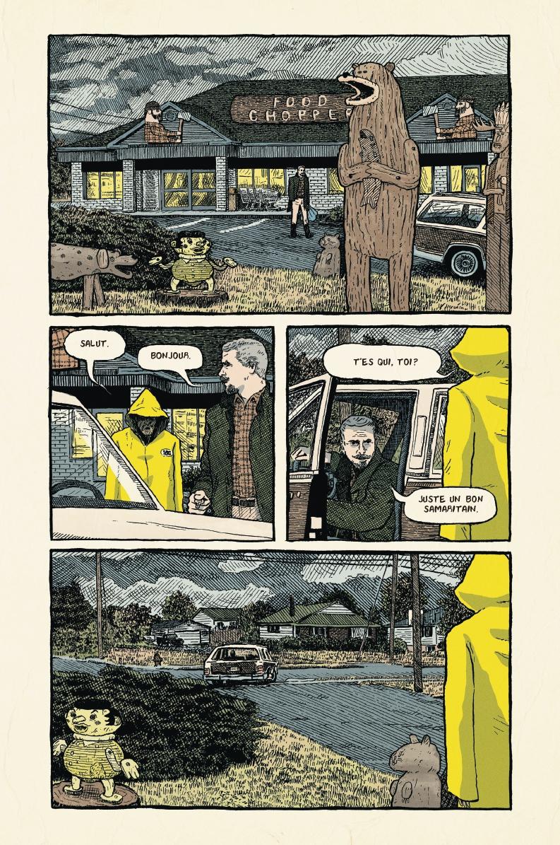 2.5 J'ai lu le premier tome et je suis moyenne convaincu par cette série qui est un peu ce que Twin Peaks aurait l'air si ça avait été créé par Charles Burns. J'ai trouvé que le scénario était un peu trop longue avec des passages qui m'ont moins intéressé que d'autres. Il faut dire que les personnages ne sont pas très attachants et ce qui me donnait envie de continuer était de connaitre la solution au mystère. Le vrai problème pour moi a été le dessin. Je n'ai pas du tout aimé ce style qui me semble volontairement moche dans la grande tradition des auteurs underground nord-américains. J'ai même trouvé que la manière dont les personnages bougeaient faisaient amateurs par moment et la mise en scène était souvent pauvre. Dommage parce que je pense qu'avec un autre dessin j'aurais surement accroché à cette univers bien particulier.