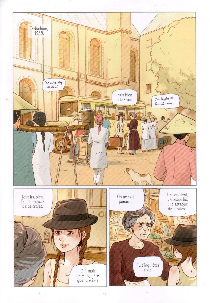 2.5 Je connais Duras de nom, mais je n'ai jamais rien lu ou vu de son œuvre parce que j'ai l'impression que je ne vais pas accrocher et disons que la lecture de ce one-shot ne va pas me faire changer d'avis. Commençons par les qualités de l'album: le dessin est très bon, les couleurs jolies et la narration est fluide. Le gros défaut de l'album est que je n'ai pas ressenti beaucoup d'émotions durant ma lecture et du coup l'histoire d'amour entre la jeune fille et le riche Chinois m'a semblé froide et je n'ai pas trop compris leur histoire d'amour ou plutôt je n'ai pas ressenti d'amour entre eux, juste de la luxure. J'imagine que c'était le but de Duras. En fait, j'ai du aller voir la fiche du roman sur wiki pour comprendre l'œuvre. Je sais pas si c'est un problème de l'adaptation, ne pouvant comparer avec le roman que je n'ai pas lu. En tous cas, j'ai trouvé que les seules scènes intéressantes étaient celles se passant au pensionnat, notamment la relation entre l'héroïne et une autre étudiante qui m'a semblé plus intéressante que sa relation avec le Chinois. Ça se laisse lire sans plus dans mon cas.