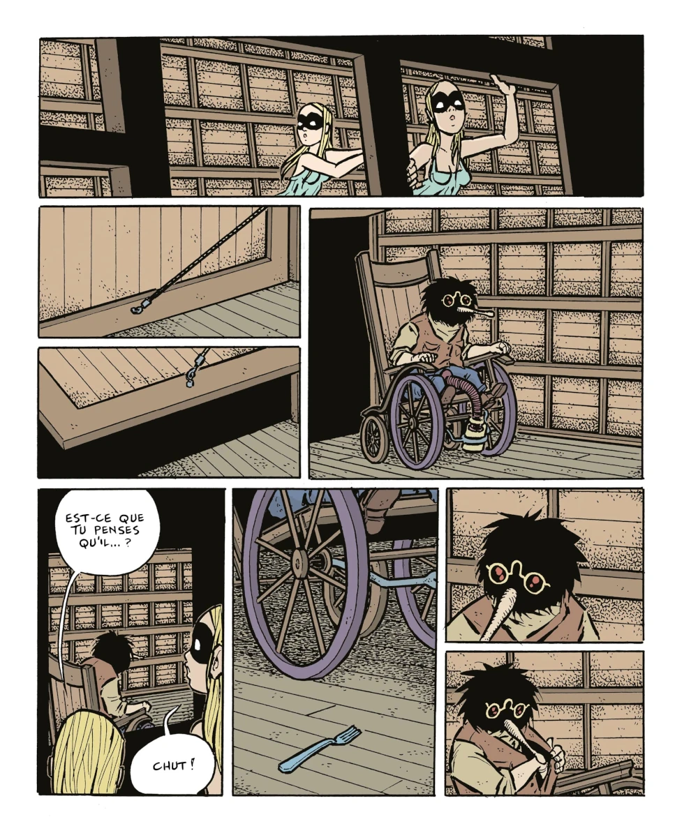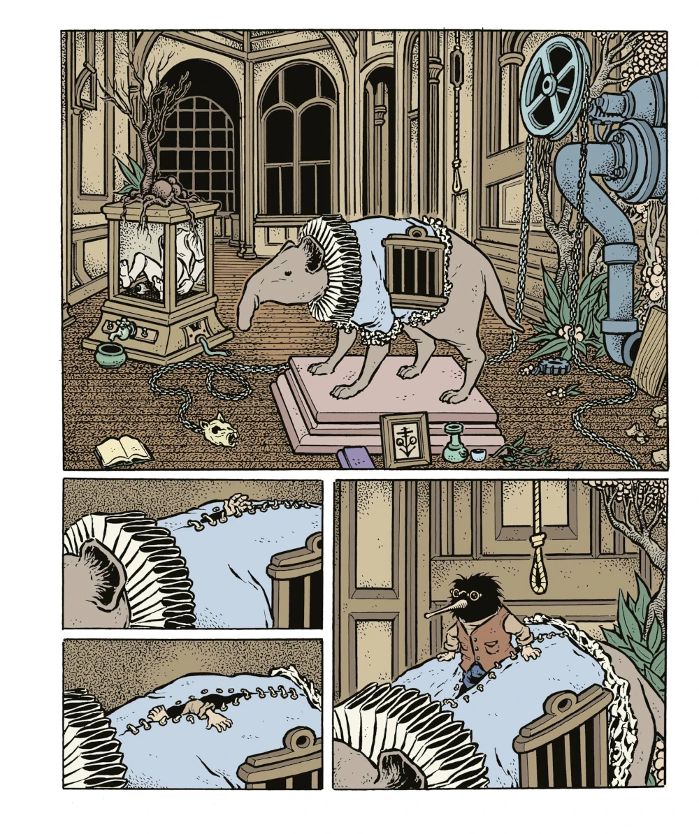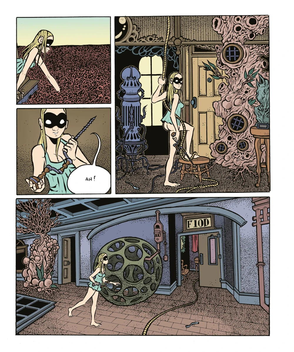 Qui sont Cochléa et Eustachia? Où vont-elles? Que font-elles? Quel est leur but? Autant de questions qui ne trouveront pas de réponses dans ce vertigineux et noir roman graphique dans lequel l’Art Nouveau, le Steampunk et le style Gothique s’entremèlent pour aspirer le lecteur dans l’exploration d’une bâtisse démesurée et tentaculaire. Savant fou belliqueux et malveillant, manoir lugubre et abyssal, créatures sinistres et eugénisme: voici l’absurde programme proposé nos deux héroines assoiffées de sensations fortes. (site éditeur)