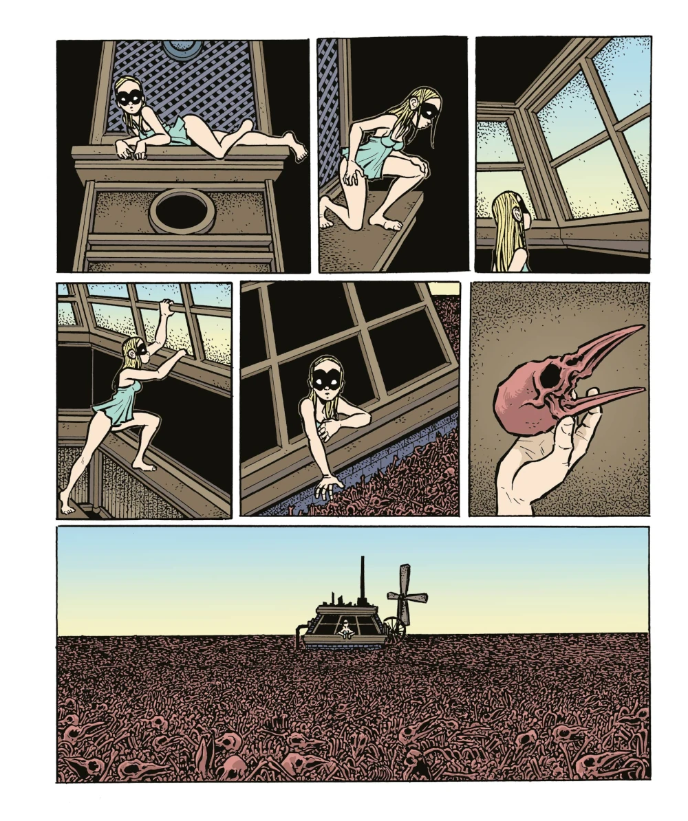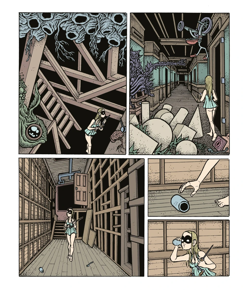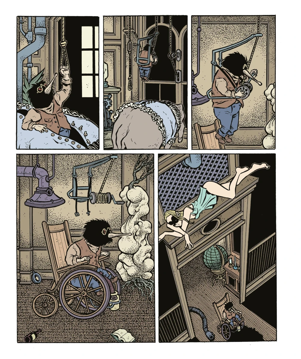 Qui sont Cochléa et Eustachia? Où vont-elles? Que font-elles? Quel est leur but? Autant de questions qui ne trouveront pas de réponses dans ce vertigineux et noir roman graphique dans lequel l’Art Nouveau, le Steampunk et le style Gothique s’entremèlent pour aspirer le lecteur dans l’exploration d’une bâtisse démesurée et tentaculaire. Savant fou belliqueux et malveillant, manoir lugubre et abyssal, créatures sinistres et eugénisme: voici l’absurde programme proposé nos deux héroines assoiffées de sensations fortes. (site éditeur)