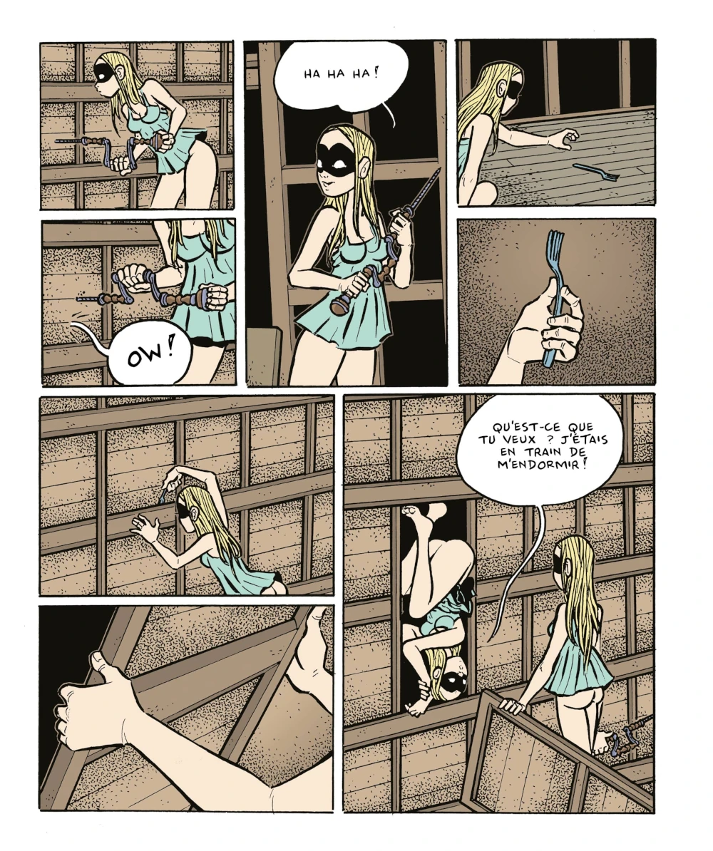 J’avais découvert cet auteur avec l’album La Machine Écureuil, qui visiblement s’est avéré très clivant. Je pense que celui-ci va l’être tout autant. Ou plutôt, je crois qu’il ne va encore une fois révéler ses merveilles qu’à certains initiés. Non qu’il s’agisse d’une secte ou d’un quelconque club d’happy few, mais plutôt que Hans Rickheit développe un univers très personnel, original et quelque peu dérangeant, qui attire ou repousse, mais qui ne saurait laisser indifférent. C’est un univers franchement marqué par un surréalisme noir – ou violet, puisque cette teinte domine, avec le marron, les deux albums de lui que je connais. Et j’aime beaucoup ces couleurs ici ! Elles s’accommodent parfaitement à l’ambiance développée par Rickheit – puisqu’il s’agit ici davantage d’ambiance que d’intrigue à proprement parler. Une longue histoire occupe les deux-tiers de l’album, durant laquelle nous suivons deux jeunes filles – Cochléa et Eustachia donc, deux jumelles qui suivent une sorte d’homme-taupe se déplaçant sur un fauteuil roulant, dans un manoir improbable. Tout est à moitié cassé, animaux et machines fusionnent pour former des êtres hybrides, des décors un peu steampunk ou simplement décalés habillent murs et sols, couloirs, tuyaux ou simples planches posées entre deux bouts de planchers éventrés servent à relier les pièces entre elles. Nous pénétrons même dans le corps de certains animaux comme on ouvre un tiroir ou comme on regarde dans une longue-vue… Très peu de dialogues, encore moins « d’explications ». En quatrième de couverture est inscrit : « Qui sont Cochléa & Eustachia ? ». Il faut dire que nous n’aurons jamais la réponse. Et que pour apprécier cet album, il ne faut pas la chercher, du moins, elle ne doit pas être nécessaire pour apprécier cette sorte de long poème visuel, noir et décalé, parfois trash (mais moins que dans La Machine Écureuil). Œuvre déroutante, mais dans laquelle je suis entré aisément, captivé. Le dernier tiers de l’album reprend plusieurs histoires courtes dans lesquelles apparaissent nos deux filles énigmatiques, dans des univers toujours aussi étranges. Cette partie m’a peut-être un peu moins accroché. D’abord parce que la colorisation, moins homogène, joue sur des couleurs un peu moins à mon goût. Ensuite parce que les cases sont cette fois-ci très – trop – petites, on apprécie moins bien le dessin, et les textes sont du coup plus difficiles à lire. Enfin, comme visiblement cela semble être des petites histoires parues en revue, Huber aurait peut-être pu en signaler l’origine en fin de volume. Mais là je chipote, car le travail éditorial est remarquable, la qualité de l’album, avec une couverture cartonnée très épaisse, un dos renforcé, la qualité du papier et des reproductions permettent d’apprécier toutes les qualités de l’œuvre de Rickheit. A feuilleter avant d’acheter, car c’est assez particulier. Mais moi j’en redemande, et j’espère que d’autres albums de cet auteur paraîtront rapidement en France.