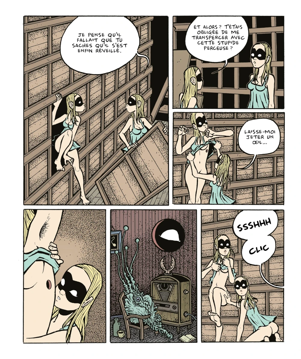Je l'ai lu en virtuel, celui-là (moins les récits annexes); ce qui a un peu perturbé mon immersion : c'est pénible de tenir son ordinateur ouvert sur ses tranches... ... J'ai pas tout compris, du coup ! Mais qu'est-ce que j'ai fortement ressenti, dis-donc ! C'est un CAUCHEMAR claustrophobe SANS ISSUE ce machin ! Malgré un graphisme éloigné de mes préférences habituelles -ça fourmille de petits détails !- je me suis surpris à lire (avec application, encore !) chaque bulle de cette Odyssée -quasiment organique !- se déroulant au sein d'une réalité aussi dépourvue de sens qu'elle apparait pourtant tout au long des planches dotée d'une réelle profondeur ; et dont il est assez difficile de s'extraire, d'ailleurs... "Donnez-moi de l'oxygèèèène !" comme le chantait DD (l'autre !). C'est très appliqué, très minutieux et, par moment, on tombe sur des cases qui sont du carrément jamais vu : aucun Yogi n'est capable de faire ce que Cochléa (je crois ?!) fait à Eustachia (je suppose ?!), côté "checkup interne" du système digestif...? Rassurez-moi ! À force d'horreur (sans effets appuyés et, donc, sacrément efficace !), ça en devient beau ou, en tous cas, abouti. Ça reste un cauchemar, néanmoins ; alors il faut vraiment avoir envie de ressentir ça pour le lire. À ce sujet, la couverture originale, à des années-lumières de celle-ci, est l'argument qui m'a donné l'envie (furieuse !) d'ouvrir le Comic : prodigieusement poétique malgré sa rigueur graphique, elle figure à elle-seule toute l'originalité fortement dérangeante de cet ovni-là.