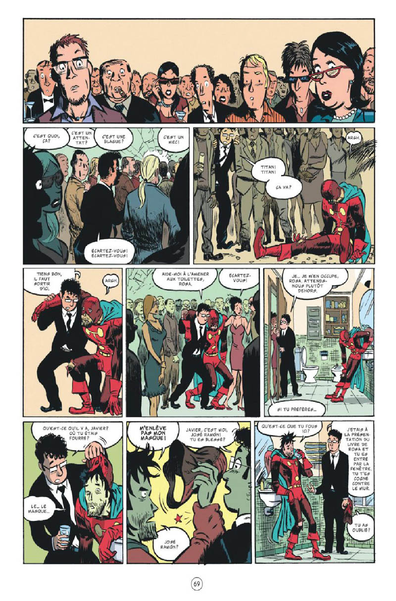 J’ai lu la série dans l’intégrale regroupant les trois tomes. Le point de départ est original et intéressant, en tout cas porteur de pas mal de potentiel. En effet, le voisin de José Ramon (étudiant réservé et tout mou), Javier, semble être en fait un super-héros. Mais Javier n’en est pas moins faible, porté sur la bouteille et la drague. Et il demande régulièrement à José de l’aider à se sortir de situations pénibles. Il y a là un potentiel comique et narratif certain, qui est en partie exploité par Garcia. Mais en partie seulement. D’abord parce que le côté super-héros s’estompe peu à peu : elle est de moins en moins présente d’un album à l’autre. On est de plus en plus dans du roman graphique très classique, avec relations amoureuses plus ou moins saines. Ensuite parce qu’il y a pas mal de longueurs. Mais bon, globalement, j’ai trouvé que ça se laissait lire agréablement, même si Garcia aurait pu davantage exploiter les différences de caractère de José et de Javier, et multiplier les malentendus et quiproquos. L’humour aurait ainsi pu être plus présent. Je ne sais pas combien de temps s’est écoulé entre la rédaction de chacun des tomes, mais il y a de l’un à l’autre pas mal d’évolutions (pas toujours expliquées clairement), que ce soit au niveau de la situation des personnages ou au niveau des liens qui les unissent. Le dessin de Pérez est moderne, avec un trait gras. Là aussi globalement je l’ai apprécié, mais là aussi avec quelques bémols. D’abord il est inégal, et sa colorisation – elle aussi assez grasse – est parfois trop sombre. La deuxième moitié du deuxième tome est plus claire à ce niveau. Mais hélas le dernier tome est entièrement en Noir et Blanc, qui plus est avec un dessin que j’ai trouvé moins soigné, plus inégal et moins réussi (avec plus de cases par planches : la lecture est moins agréable je trouve. Ça m’a donné l’impression de lire un dernier tome un peu bâclé, ou alors publié dans la précipitation, pas encore « terminé ». Bref, une histoire qui selon moi exploite mal le potentiel de départ, mais qui s’avère quand même une lecture plaisante.
