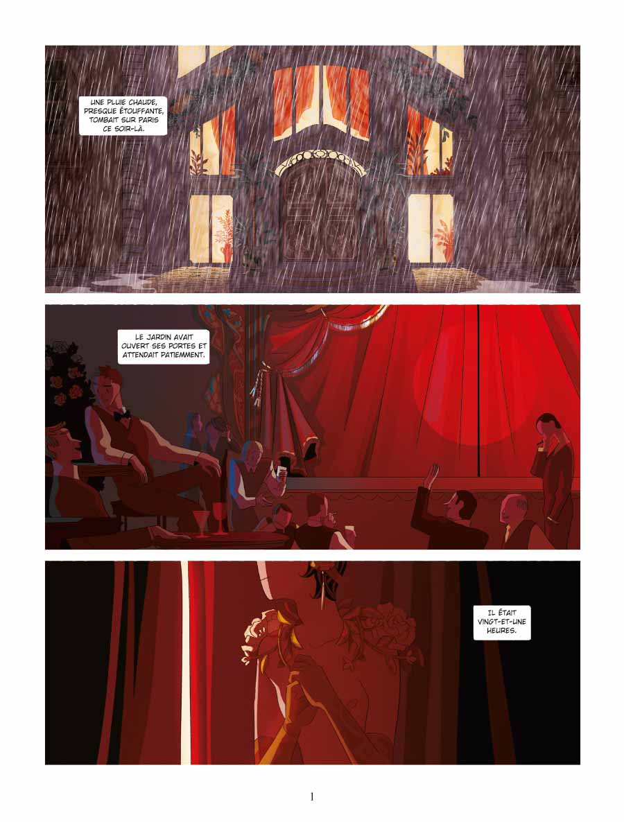 Pour apprécier cet album à sa juste valeur, il faut faire abstraction de tout ce qui pourrait dégrader cette parenthèse enchantée. Car, dans un temps pourtant agité (l’entre-deux guerres), rien ne semble vouloir troubler la sérénité du cabaret au nom évocateur de Jardin (un jardin d’Eden où toutes les danseuses ont des noms de fleurs, y compris le fils de la patronne, Rose, qui va devenir célèbre en se présentant au public habillé en femme). Il faut donc accepter non pas ce désir assumé de Rose, mais l’absence de jugement, voire de rejet violent de la part de la « bonne société », y compris en province et hors du cadre du cabaret – où la permissivité était plus grande. C’est assez improbable pour l’époque, mais cela passe très bien ici. Le récit joue sur la finesse des émotions, la finesse des relations (entre Rose et l’homme qui, doucement, va devenir son mentor, sans que l’amour ou le sexe ne soient évoqués), la finesse du dessin aussi. En effet, on a là quelque chose qui se rapproche de l’illustration, presque de gravures de mode d’époque : cela renforce le caractère presque « hors sol » de l’histoire, qui elle se laisse lire agréablement. Le thème de départ (les relations entre des danseuses de cabaret) et le dessin n’étaient a priori pas des plus accrocheurs pour moi, mais la lecture a été agréable.